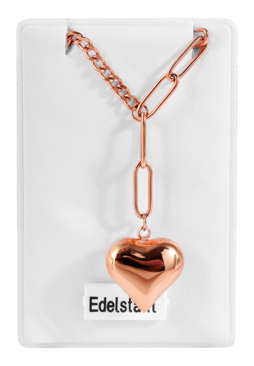 O colar feminino de destaque feito de aço inoxidável robusto é particularmente atraente graças à sua combinação de correntes. Ao contrário de outros “colares típicos”, este colar consiste em uma larga corrente de meio-fio e uma longa corrente de meio-fio. O pingente em forma de coração altamente polido, com 15 mm de comprimento, 16 mm de largura e 6 mm de espessura e, portanto, muito adequado para gravação, também proporciona um toque feminino sutil. As dimensões da corrente larga do meio-fio são 42 cm de comprimento, 3 mm de largura e 1,5 mm de espessura. O comprimento da corrente longa do meio-fio é de 8 cm, a largura é de 4 mm e a espessura do material é de 1 mm. A corrente pode ser aberta e fechada com um fecho lagosta da mesma cor, também feito de aço inoxidável.