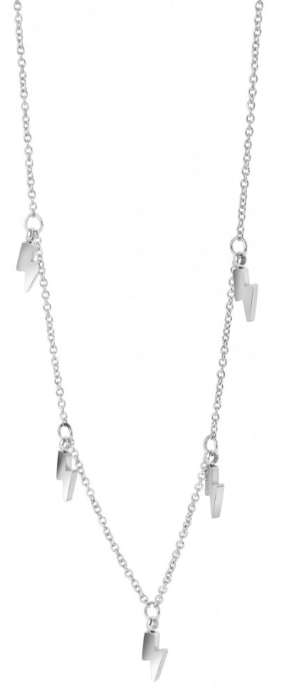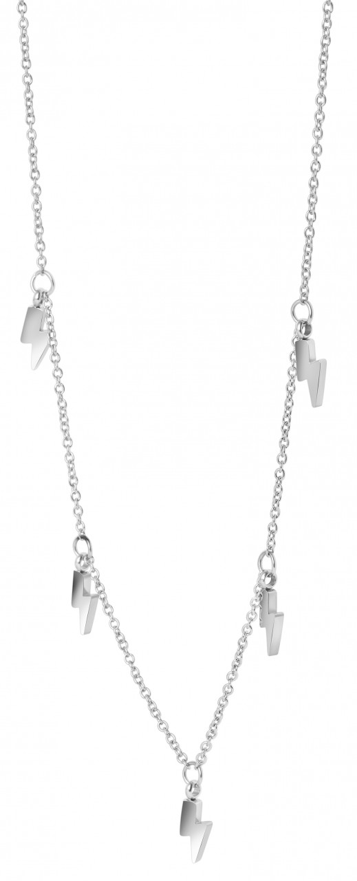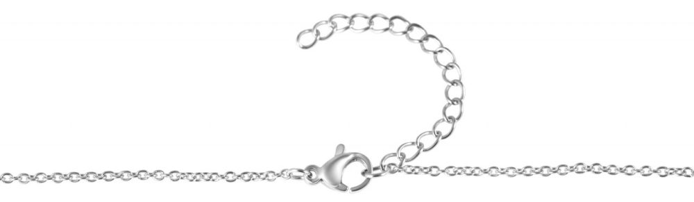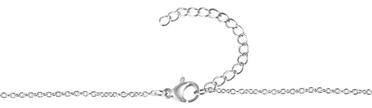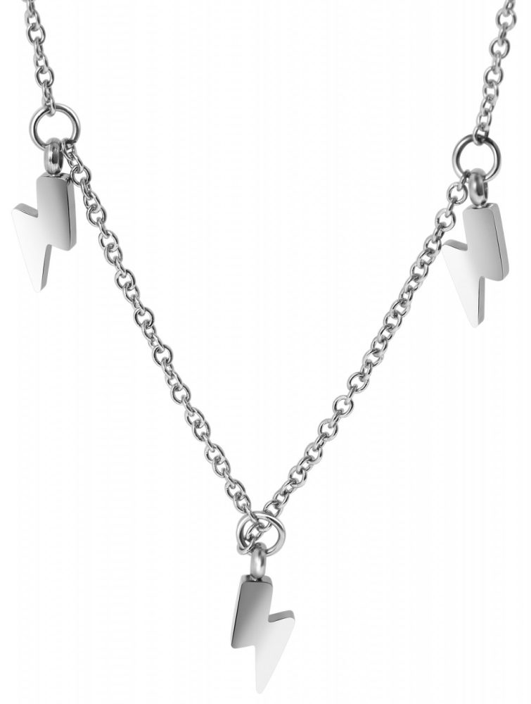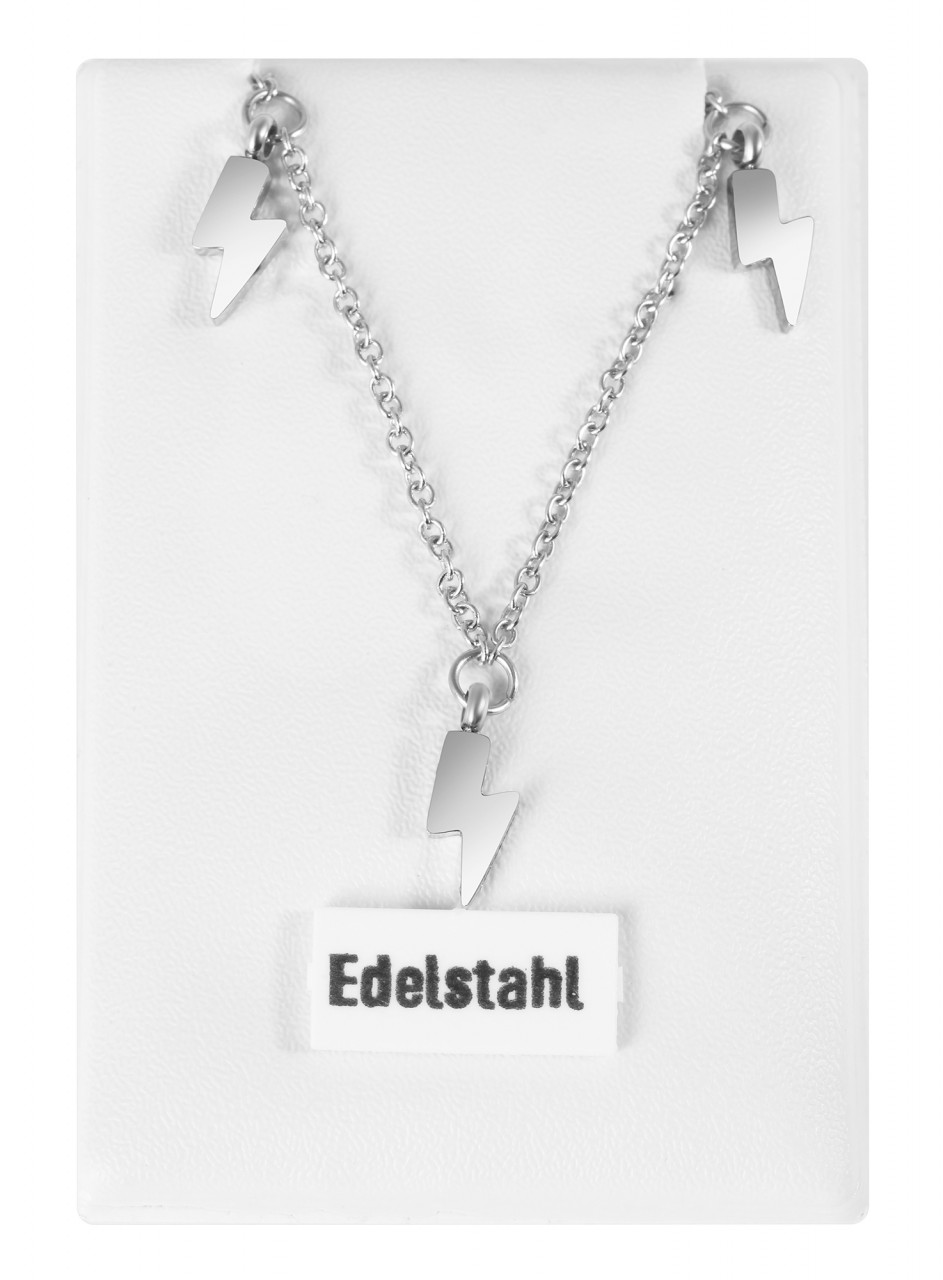 Este colar no popular padrão de corrente de âncora é feito de aço inoxidável e tem 38 cm de comprimento, adaptando-se perfeitamente ao pescoço do usuário. Graças a uma corrente extensora de 5 cm é possível variar o comprimento. O colar é acompanhado por três pequenos pingentes brilhantes em forma de relâmpago que adicionam ótimos detalhes e um toque de elegância. Devido à excelente escolha de materiais de alta qualidade, esta joia é durável e robusta. Além disso, o aço inoxidável é hipoalergênico e, portanto, particularmente amigo da pele. O clássico fecho lagosta garante que o colar fique confortável e seguro no pescoço.
