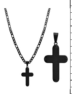 O colar com pingente de cruz foi feito em aço inoxidável no padrão Figaro e está disponível em diversas cores. Os elementos de corrente plana garantem um ajuste confortável e também garantem uma aparência elegante. O acabamento superficial brilhante também contribui para isso. A corrente é presa na nuca por um fecho lagosta de aço inoxidável. O comprimento da corrente é de 60 cm, a largura é de 4 mm e a espessura do material é de 1 mm. O colar traz ainda um pingente de cruz, também feito de aço inoxidável, que é brilhante na frente e fosco atrás. Tem comprimento de 45 mm, largura de 27 mm e espessura de 2 mm e, portanto, oferece área suficiente para gravação.