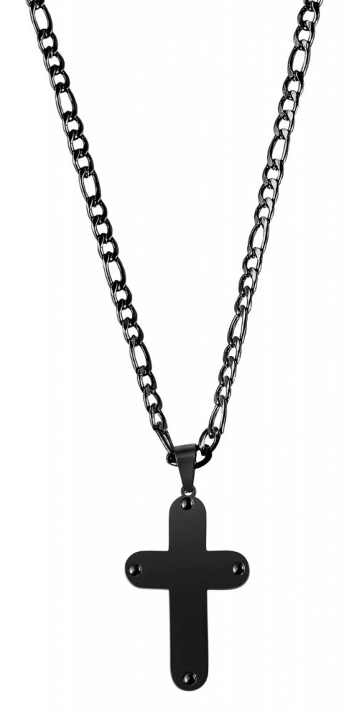 O colar com pingente de cruz foi feito em aço inoxidável no padrão Figaro e está disponível em diversas cores. Os elementos de corrente plana garantem um ajuste confortável e também garantem uma aparência elegante. O acabamento superficial brilhante também contribui para isso. A corrente é presa na nuca por um fecho lagosta de aço inoxidável. O comprimento da corrente é de 60 cm, a largura é de 4 mm e a espessura do material é de 1 mm. O colar traz ainda um pingente de cruz, também feito de aço inoxidável, que é brilhante na frente e fosco atrás. Tem comprimento de 45 mm, largura de 27 mm e espessura de 2 mm e, portanto, oferece área suficiente para gravação.
