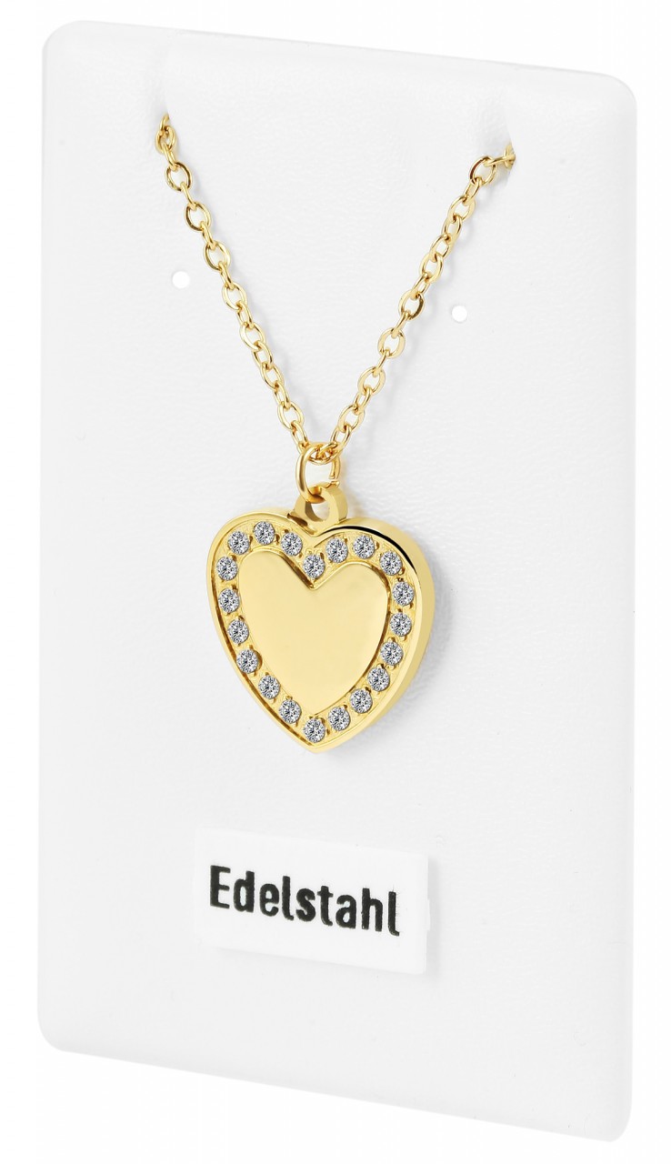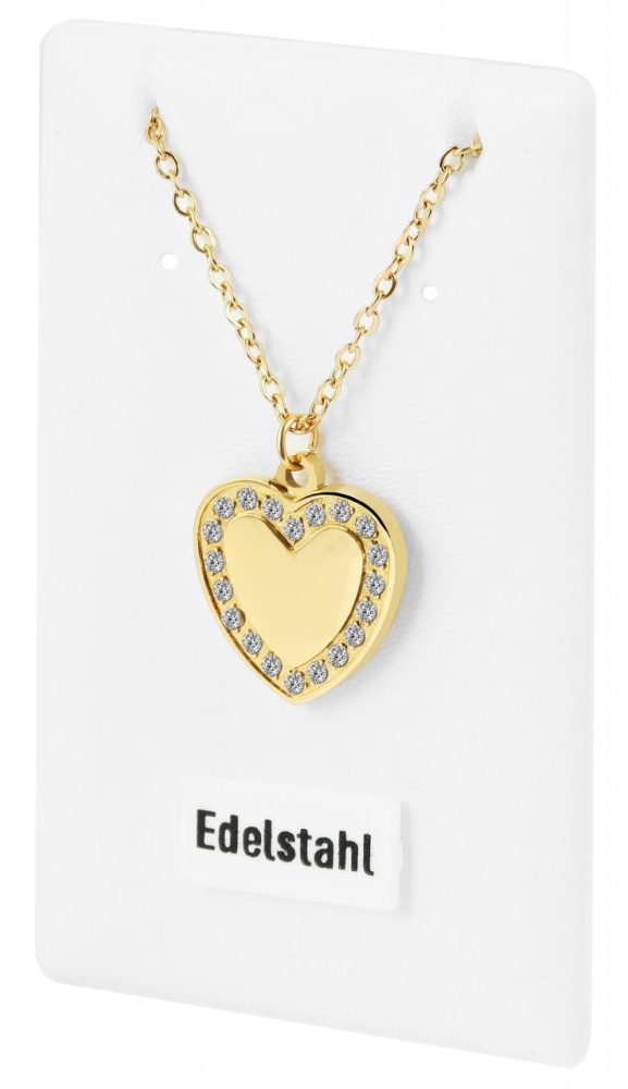 O colar da marca Praktik é feito de aço inoxidável e está disponível em diversas cores. É constituída por uma corrente de âncora com 43 cm de comprimento, decorada com um pingente de coração gravável em aço inoxidável. Além disso, uma corrente de extensão de 5 cm é fixada em uma extremidade da corrente, o que permite variar o comprimento em 5 cm. O pingente gravado é decorado ao redor com pedras simil brilhantes. Tem comprimento de 18 mm, largura de 16 mm e espessura de material de 2 mm. Graças à possibilidade de design individual, o colar é uma ideia excelente e pessoal para presente. O material é muito robusto, durável e também adequado para quem sofre de alergias, uma vez que o aço inoxidável é particularmente amigo da pele. Além disso, as joias são parcialmente refinadas com revestimento iônico de alta qualidade.