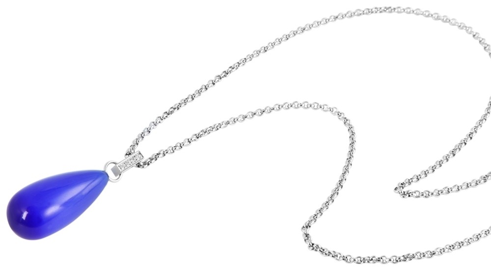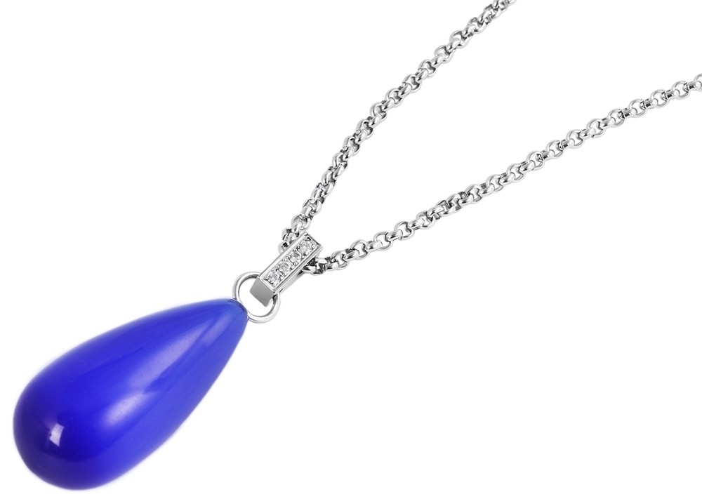 O colar de ervilha da marca Akzent é feito de aço inoxidável. O material garante uma longa vida útil do colar. A corrente é prateada. A corrente é presa na nuca por um fecho lagosta de aço inoxidável. O comprimento da corrente é de 65 cm. A espessura da corrente é de 3 mm. O colar também possui um pingente de aço inoxidável. O tamanho do pingente resulta da largura de 19 mm e da altura de 58 mm. O destaque ótico é aquele com cristais de zircônia. O pingente de corrente é em azul.