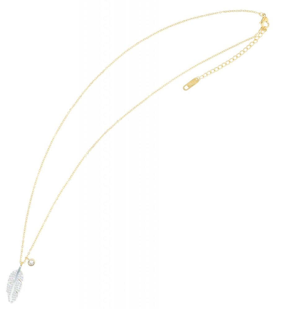 O colar e o pingente são feitos de aço inoxidável de alta qualidade e brilham em um banho de íon dourado quente. Este requinte não só confere à joia uma aparência radiante, mas também longevidade e robustez adicionais. Com um comprimento total de 45 cm e uma corrente adicional de extensão de 5 cm, este colar oferece a flexibilidade para se adaptar perfeitamente a qualquer formato de pescoço. O prático mosquetão garante um fecho seguro, transporte confortável e fácil manuseio. O pingente de pena, medindo 25 x 8 x 2 mm, é incrustado com pedras simil brilhantes que conferem à joia um brilho suave.