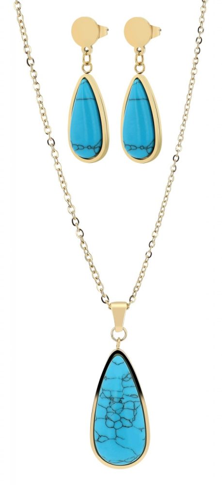 O conjunto de jóias de realce “Mali” é uma combinação especial de peças de joalharia, composta por um colar e brincos a condizer. Feito de aço inoxidável, o conjunto de jóias não só tem uma estética apelativa, como também é durável e duradouro. O aço inoxidável é conhecido pela sua resistência à corrosão e facilidade de manutenção, o que garante que as jóias mantêm a sua aparência mesmo após um uso prolongado. A combinação do aço inoxidável com o acabamento em pedra de cor turquesa confere ao conjunto um aspeto moderno mas intemporal. O colar, com 45 cm de comprimento, é fechado de forma segura com um fecho de lagosta. O destaque vai para o pendente em forma de gota que pende da corrente. Este pendente é decorado com pedras e mede uns generosos 32 x 14,5 x 5,5 mm. Os brincos a condizer são também decorados com elementos em forma de gota.