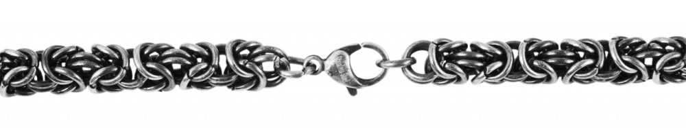 A corrente bizantina prateada da marca Akzent é feita de aço inoxidável. É ligeiramente enegrecido e por isso tem um visual especial que se adapta perfeitamente a qualquer look. A corrente pode ser aberta e fechada com um mosquetão, também feito de aço inoxidável. A corrente king está disponível nos comprimentos de 43 cm, 50 cm, 60 cm e 70 cm e tem 8 mm de espessura. O material robusto e o acabamento de alta qualidade prometem ao colar uma longa vida útil. O colar é um ótimo acessório que pode ser facilmente combinado. Esta joia especial é ideal como presente, por exemplo, para um aniversário, Dia dos Namorados ou Natal.