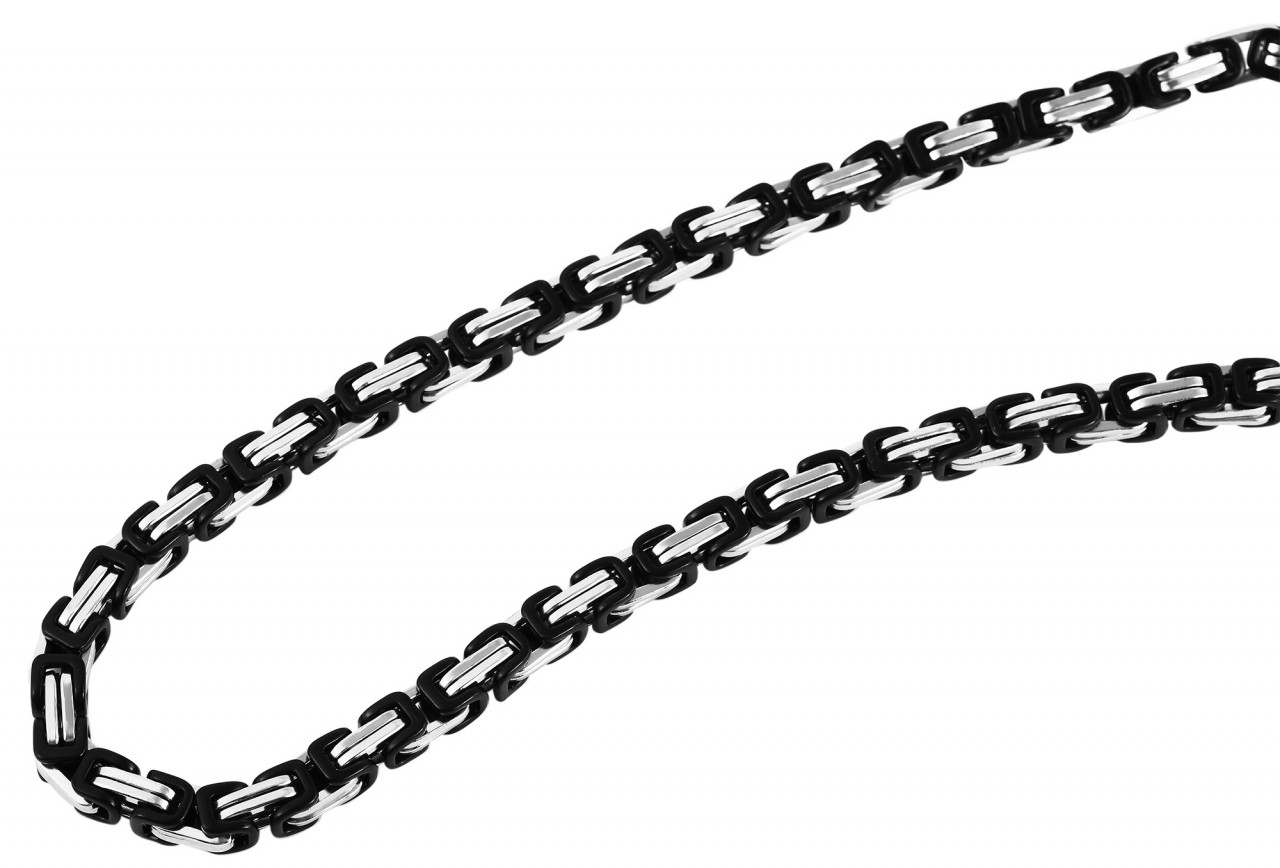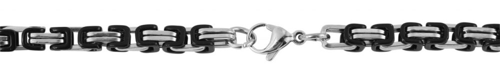 A corrente bizantina prateada da marca Akzent é feita de aço inoxidável. Os elementos de aço inoxidável que formam o padrão real são parcialmente feitos de elementos pretos, o que confere à corrente um visual especial. Tem espessura de 6,5 mm. A corrente pode ser aberta e fechada com um mosquetão prateado, também feito de aço inoxidável. Pode ser combinado particularmente bem com a pulseira de corrente King correspondente. As correntes e pulseiras King são conhecidas por seu design masculino e sólido. Destacam-se pelos inúmeros elementos que se interligam de forma especial e completam qualquer look forte.