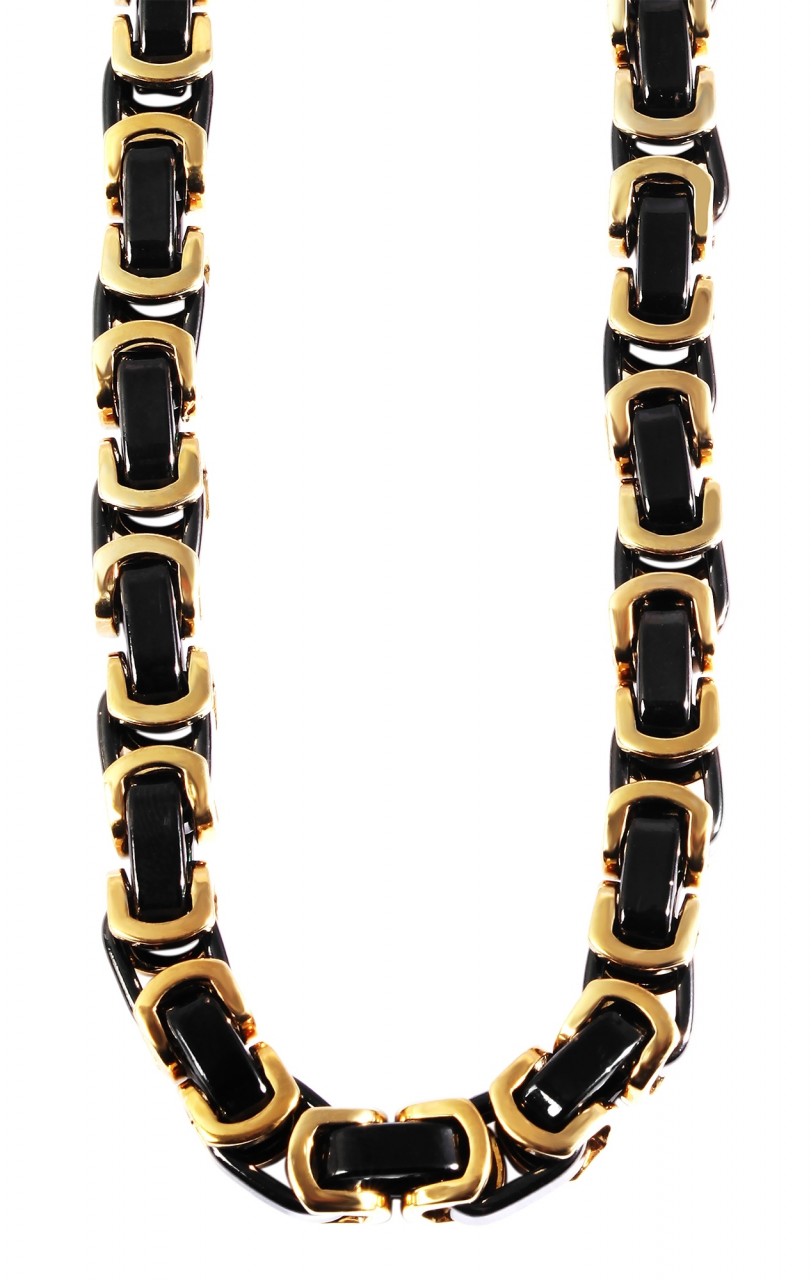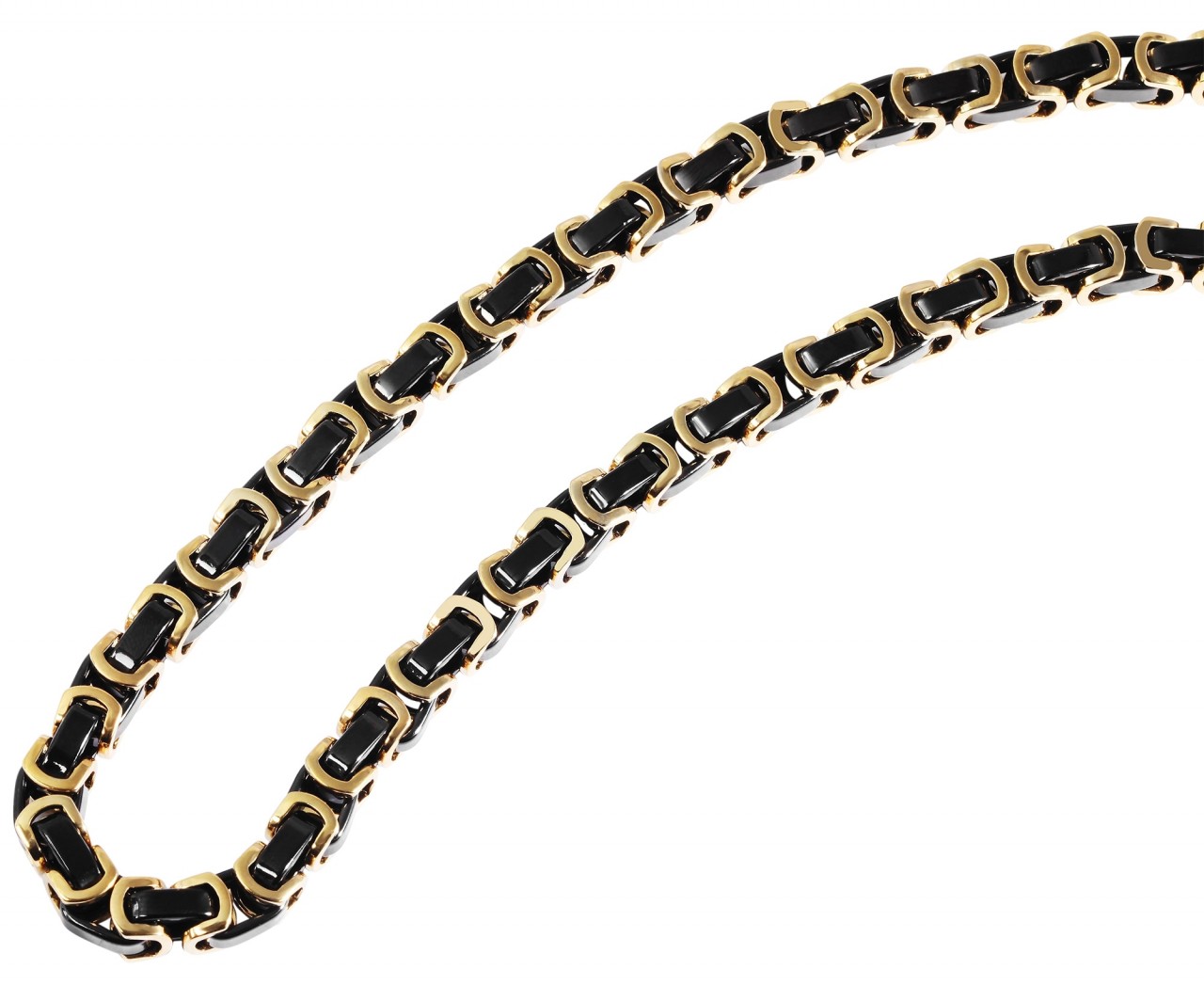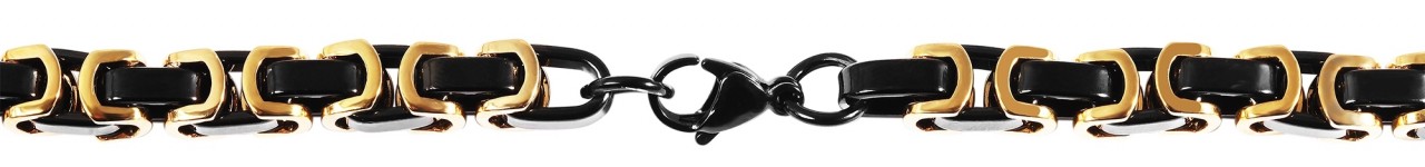 A corrente bizantina dourada da marca Akzent é feita de aço inoxidável. Os elementos de aço inoxidável que formam o padrão real são parcialmente feitos de elementos pretos, o que confere à pulseira um visual especial. Tem comprimento total de 60 cm e espessura de 7,5 mm. A corrente pode ser aberta e fechada com um mosquetão preto, também feito de aço inoxidável. Pode ser combinado particularmente bem com a pulseira de corrente King correspondente. As correntes e pulseiras King são conhecidas por seu design masculino e sólido. Destacam-se pelos inúmeros elementos que se interligam de forma especial e completam qualquer look forte.