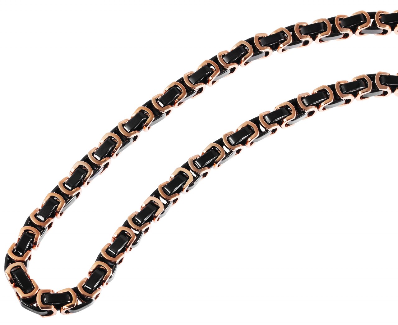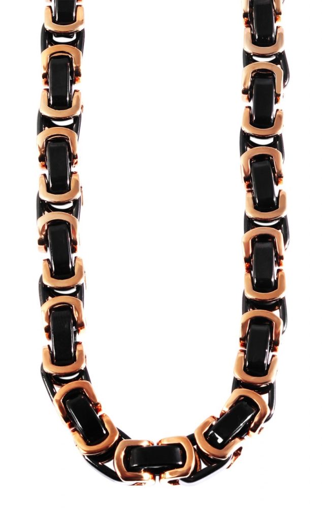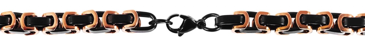 A corrente bizantina em ouro rosa da marca Akzent é feita de aço inoxidável. Os elementos de aço inoxidável que formam o padrão real são parcialmente feitos de elementos pretos, o que confere à corrente um visual especial. Tem comprimento total de 60 cm e espessura de 7,5 mm. A corrente pode ser aberta e fechada com um mosquetão preto, também feito de aço inoxidável. Pode ser combinado particularmente bem com a pulseira de corrente King correspondente. As correntes e pulseiras King são conhecidas por seu design masculino e sólido. Destacam-se pelos inúmeros elementos que se interligam de forma especial e completam qualquer look forte.