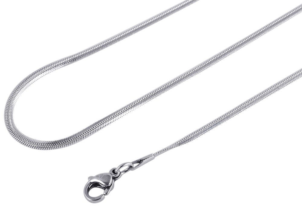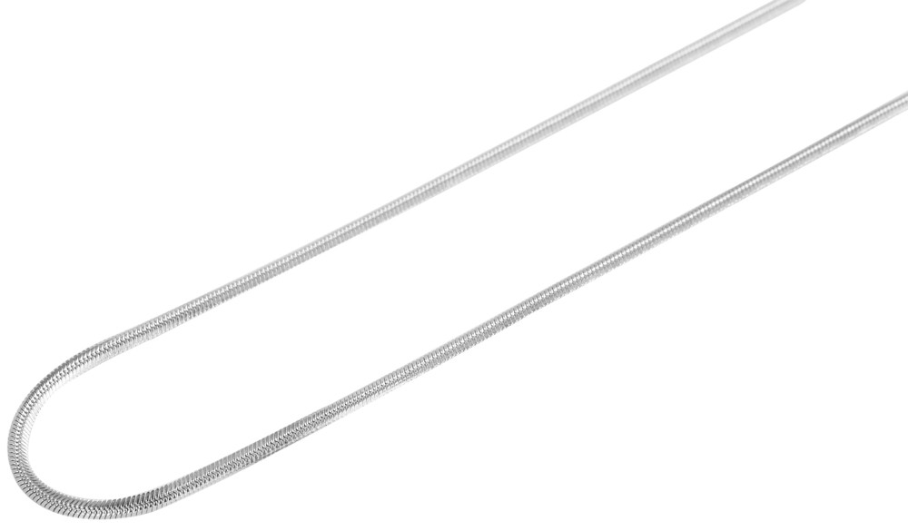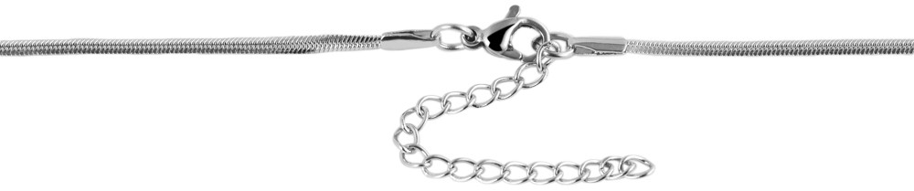 O colar prateado da marca Akzent é feito de aço inoxidável com padrão cobra. A espessura do material é de 2 mm. Além disso, uma corrente de extensão de 5 cm de comprimento é presa a uma extremidade da corrente. Isso permite variar o comprimento em até 5 cm e adaptar a joia a qualquer look. A corrente de cobra simples pode ser aberta e fechada com um mosquetão prateado, que também é feito de aço inoxidável.