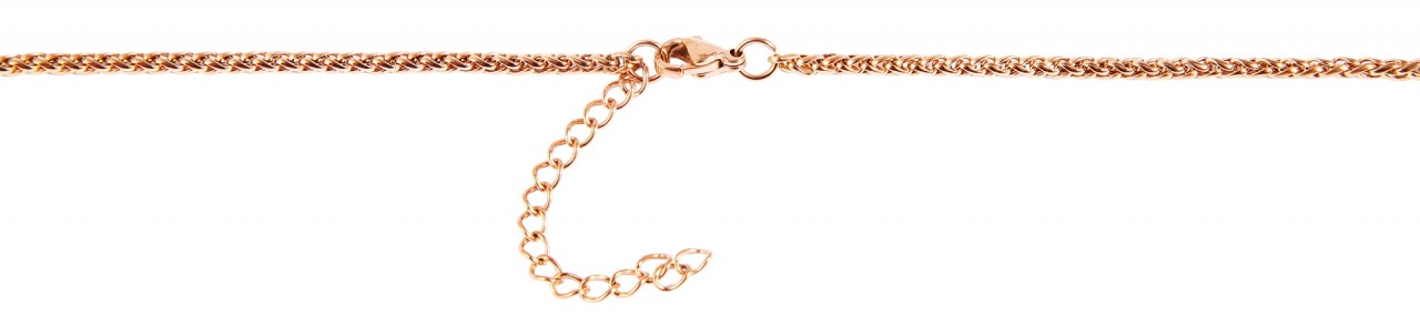 A corrente de aço inoxidável em ouro rosa da marca Akzent é revestida com IPR e fabricada num padrão de trança. Está disponível em diferentes comprimentos e tem uma espessura de corrente de 2,5 mm. Os elementos individuais da corrente entrançada estão ligados entre si de uma forma especial, criando um aspeto único sob a forma de uma trança entrançada. O padrão elegante da corrente confere à peça de joalharia um aspeto muito especial, pelo que pode ser usada em qualquer ocasião. O colar pode ser aberto e fechado com um fecho de lagosta cor de ouro rosa, que também é feito de aço inoxidável. Na extremidade da corrente, encontra-se também uma corrente de extensão de 5 cm, que permite variar o comprimento até 5 cm e adaptar a corrente de tranças a qualquer roupa.