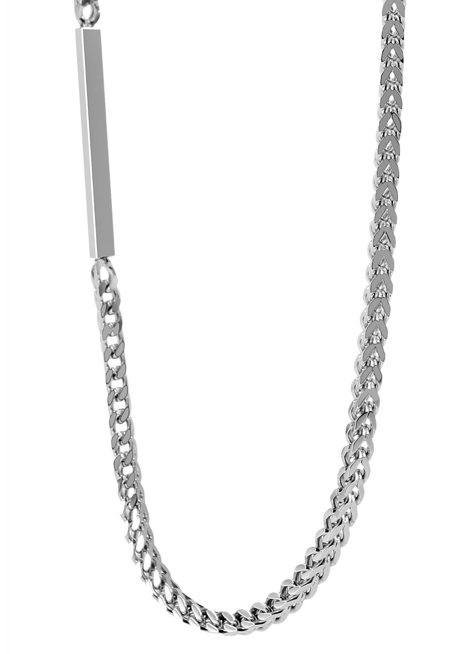 A corrente de aço inoxidável da marca Akzent é confecionada no padrão de corrente quadrada franco. A disposição dos elementos, como uma corrente de 3 mm de espessura, confere ao colar um aspeto masculino e magnífico. Este colar consiste em uma série de elementos em forma de V firmemente conectados que garantem um alto nível de conforto e tornam o visual tão sólido. O colar pode ser aberto e fechado com um mosquetão, também feito de aço inoxidável. Além disso, um elemento quadrado de aço inoxidável de 30 x 3 mm é incorporado na lateral da corrente, que pode ser equipado com pequenas gravuras.