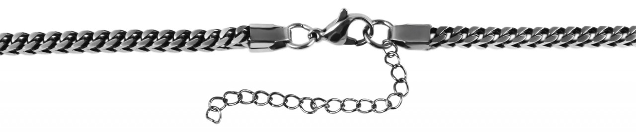 O colar da marca Praktik é feito de aço inoxidável com padrão blindado. O material robusto e sólido promete uma longa vida útil. A superfície da corrente foi tratada com revestimento iônico e possui acabamento prateado/escurecido. A joia pode ser aberta e fechada com um mosquetão, que também é feito de aço inoxidável. A disposição em fila dupla dos elementos da corrente confere à corrente um aspecto masculino e robusto. A joia está disponível nos comprimentos de 50 cm e 60 cm.