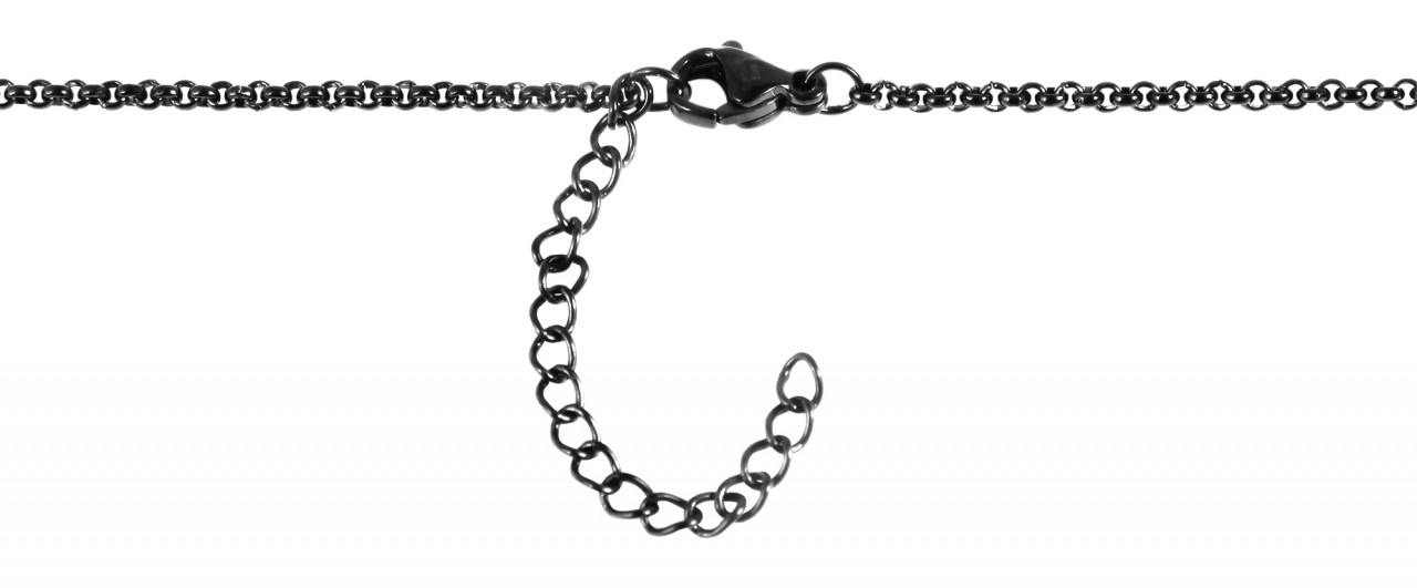 A corrente de aço inoxidável preta da marca Akzent é fabricada num padrão de corrente em forma de ervilha e está disponível em diferentes comprimentos. A espessura da corrente é de 2 mm. A disposição dos elementos circulares confere à corrente pea o seu aspeto caraterístico e confere ao design um aspeto clássico mas elegante. O colar pode ser aberto e fechado com um fecho de lagosta preto, que também é feito de aço inoxidável e complementa visualmente o aspeto geral. Uma corrente de extensão de 5 cm é igualmente fixada na extremidade da corrente, o que lhe permite variar o comprimento até 5 cm e adaptar a corrente pea a qualquer roupa. Esta peça de joalharia é um colar com uma forma bonita e um valor de reconhecimento que pode ser usado com ou sem um pendente decorativo.