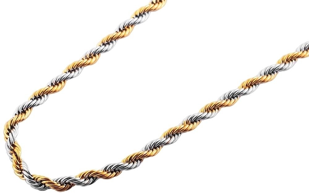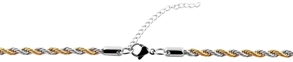 A corrente com cordão de realce é feita de aço inoxidável, é bicolor (prata/ouro) e também é banhada a IP. O material é à prova de manchas, à prova de ferrugem e durável. O colar consiste em dois fios de corrente que estão ligados entre si. Este processo garante uma aparência em forma de espiral e um design clássico e elegante da corrente. O colar é preso na nuca por um fecho lagosta de aço inoxidável. A corrente está disponível em diferentes comprimentos e pode ser estendida em 5 cm se necessário, tornando-a ajustável individualmente. A espessura da corrente é de 4 mm.