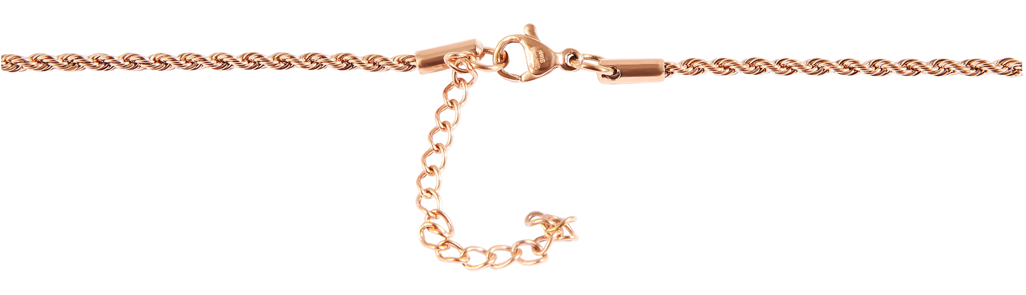 A corrente de aço inoxidável rose gold da marca Praktik é feita em padrão de cordão e está disponível em diversos comprimentos. A espessura da corrente é de 2 mm. Na corrente de cordão, dois fios de corrente individuais são torcidos juntos, criando um padrão especial. O elegante padrão de corrente confere à joia um visual muito especial, podendo ser usada em qualquer ocasião. O colar pode ser aberto e fechado com um mosquetão rose gold, também feito de aço inoxidável. Além disso, há uma corrente extensora de 5 cm de comprimento presa na ponta da corrente, que permite variar o comprimento em até 5 cm e adaptar a corrente com cordão a qualquer look.