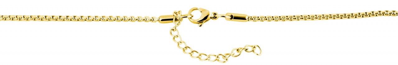 A corrente de aço inoxidável dourada da marca Akzent é feita num padrão veneziano e está disponível em diferentes comprimentos. A espessura da corrente é de 2 mm. Os elementos individuais da corrente veneziana são ligeiramente arredondados e entrelaçados. Como resultado, este colar é muito confortável de usar e envolve suavemente o pescoço da utilizadora. O colar pode ser aberto e fechado com um fecho de lagosta dourado, que também é feito de aço inoxidável e complementa visualmente o aspeto geral. Uma corrente de extensão de 5 cm está igualmente ligada à extremidade da corrente, permitindo-lhe variar o comprimento até 5 cm e adaptar a corrente veneziana a qualquer roupa. Esta peça de joalharia é um colar com uma forma bonita e um valor de reconhecimento que pode ser usado com ou sem um pendente decorativo.