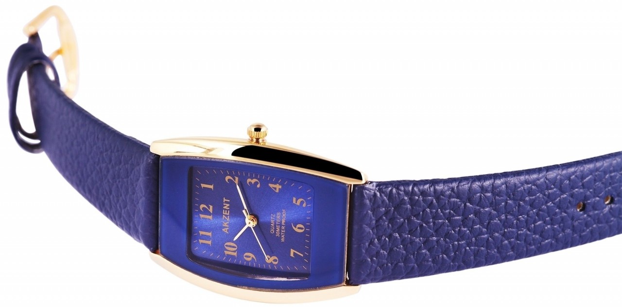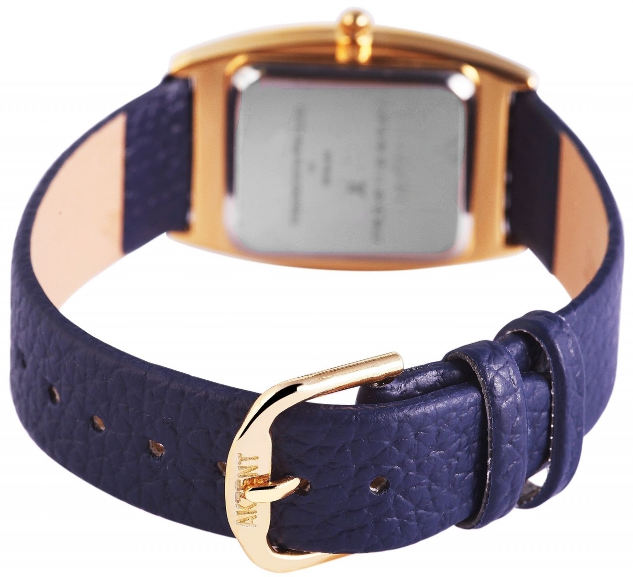 O relógio analógico Akzent para senhora possui um movimento de quartzo de alta qualidade. A designação do modelo é AK0401. A bracelete em pele sintética tem 18 mm de largura e abre-se com uma fivela de pino. O comprimento total é de 22 cm. A caixa metálica com vidro mineral mede 29×39 mm e tem 8 mm de altura. A tampa da caixa é feita de aço inoxidável. O relógio é testado a uma pressão de 3 ATM.