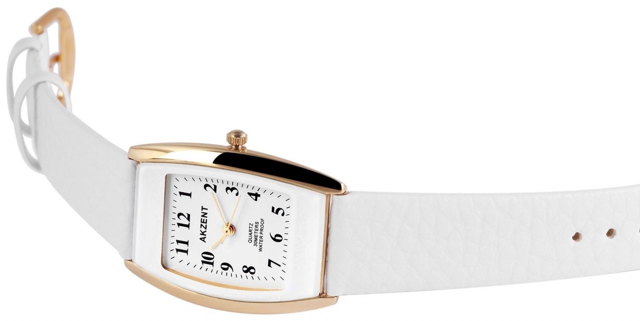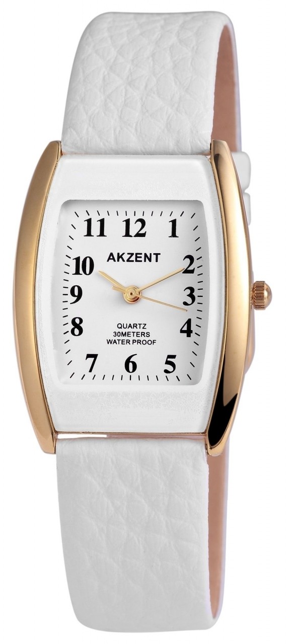 O relógio analógico Akzent para senhora possui um movimento de quartzo de alta qualidade. A designação do modelo é AK0401. A bracelete em imitação de pele tem 18 mm de largura e abre-se com uma fivela de pino. O comprimento total é de 22 cm. A caixa metálica com vidro mineral mede 29×39 mm e tem 8 mm de altura. A tampa da caixa é feita de aço inoxidável. O relógio é testado a uma pressão de 3 ATM.