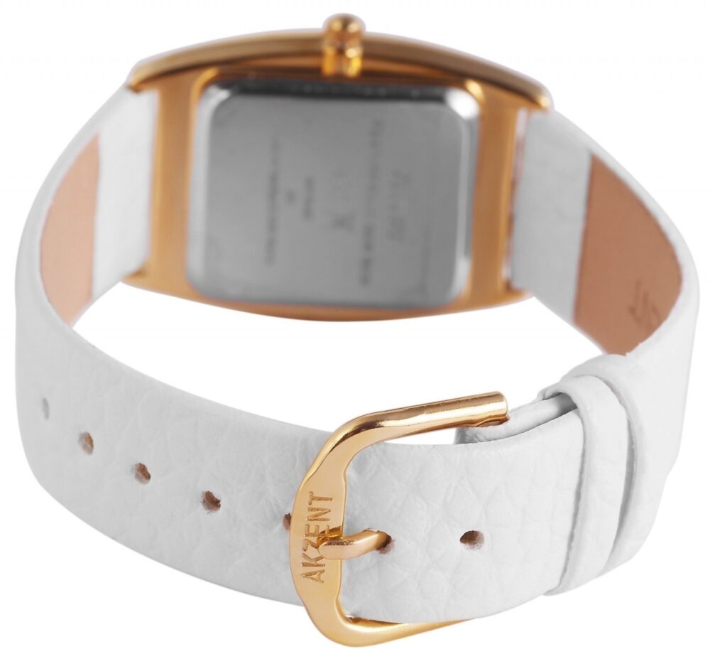 O relógio analógico Akzent para senhora possui um movimento de quartzo de alta qualidade. A designação do modelo é AK0401. A bracelete em imitação de pele tem 18 mm de largura e abre-se com uma fivela de pino. O comprimento total é de 22 cm. A caixa metálica com vidro mineral mede 29×39 mm e tem 8 mm de altura. A tampa da caixa é feita de aço inoxidável. O relógio é testado a uma pressão de 3 ATM.