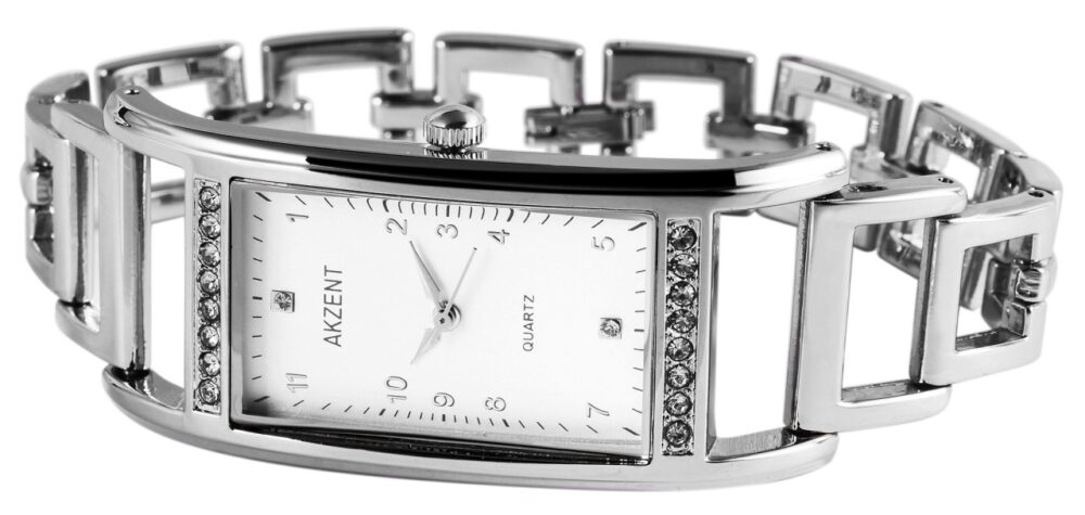 O relógio analógico Akzent para senhora possui um movimento de quartzo de alta qualidade. A bracelete metálica tem 18 mm de largura e abre-se com um fecho de correr. O comprimento total é de 20 cm. A caixa de metal com vidro mineral e 9 mm de altura. A caixa é realçada por um friso de cristal. A tampa da caixa é feita de aço inoxidável. O friso de cristal no mostrador é também um destaque visual. O relógio é testado a uma pressão de 3 ATM.
