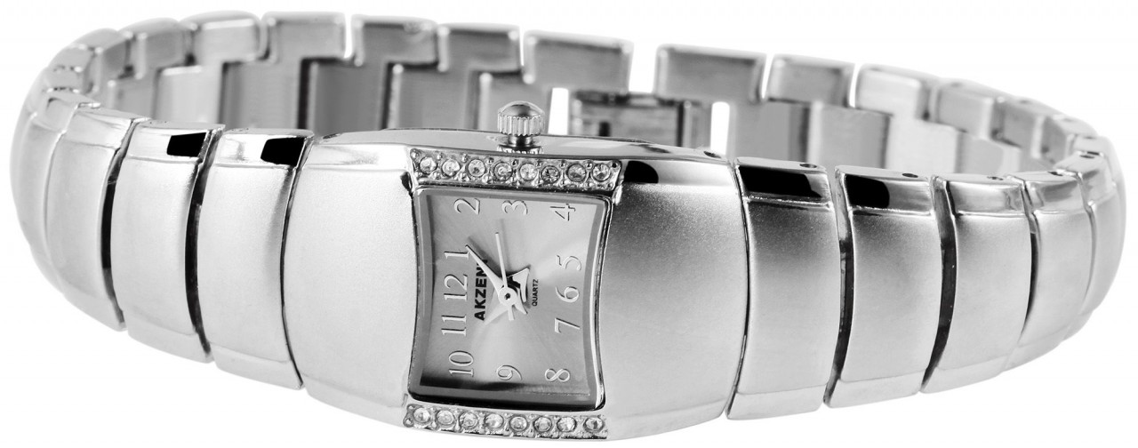O relógio analógico Akzent para senhora possui um movimento de quartzo de alta qualidade. A bracelete metálica tem 17 mm de largura e abre-se com um fecho de correr. O comprimento total é de 20 cm. A caixa de metal com vidro mineral mede 19 mm e tem 8 mm de altura. A caixa é realçada por um friso de cristal. A tampa da caixa é feita de aço inoxidável. O relógio é testado contra pressão de 3 ATM.