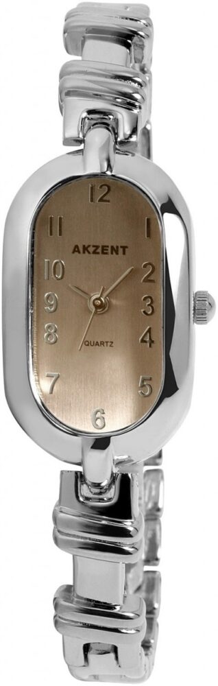 O relógio analógico Akzent para senhora possui um movimento de quartzo de alta qualidade. A bracelete metálica tem 8 mm de largura e abre-se com um fecho de correr. O comprimento total é de 19 cm. A caixa metálica com vidro mineral mede 20 mm e tem 10 mm de altura. A tampa da caixa é feita de aço inoxidável. O relógio é testado contra pressão de 3 ATM.