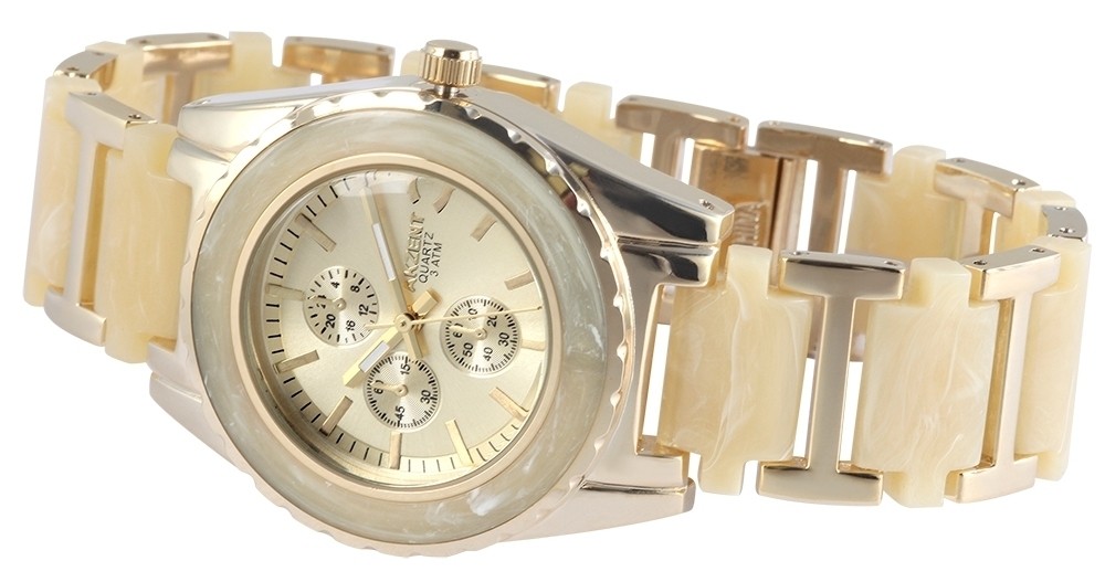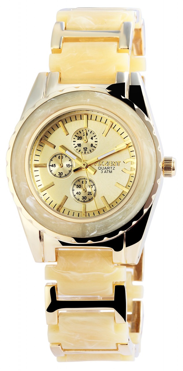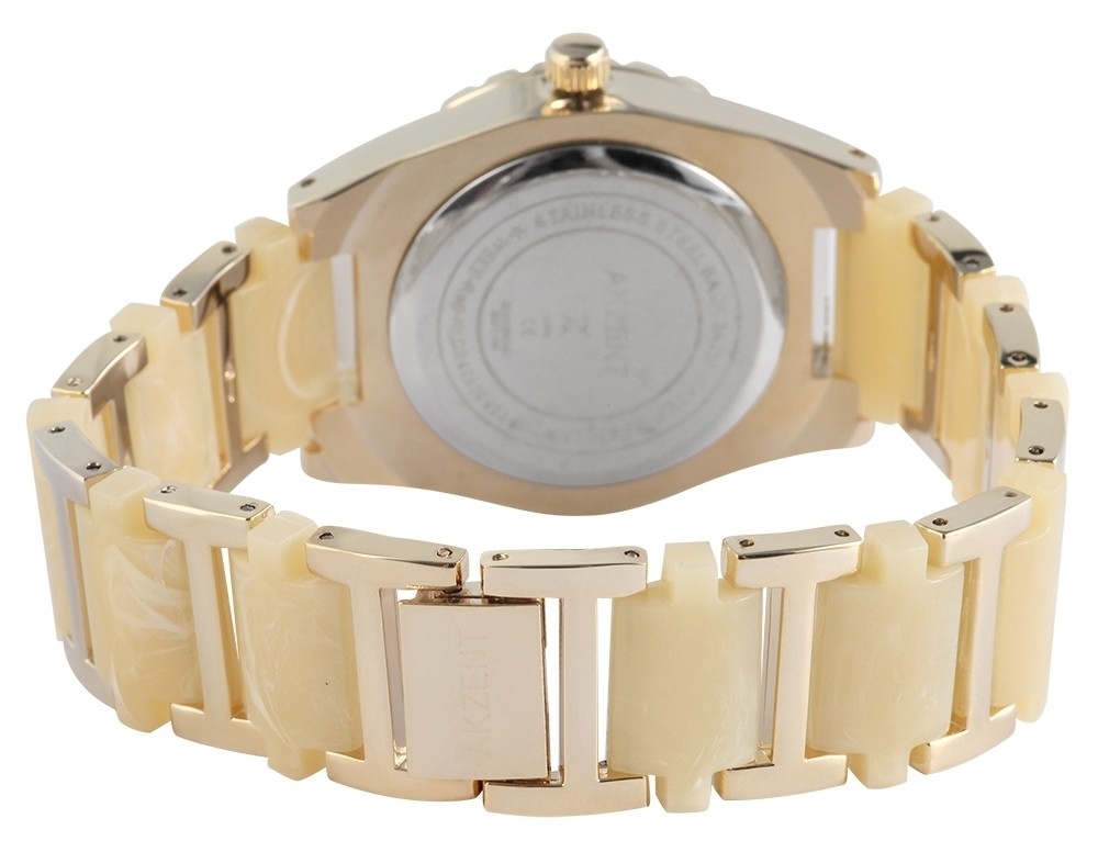 O relógio analógico Akzent para senhora possui um movimento de quartzo de alta qualidade. A bracelete metálica tem 20 mm de largura e abre-se com um fecho de correr. O comprimento total é de 21 cm. A caixa metálica com vidro mineral mede 39 mm e tem 13 mm de altura. A tampa da caixa é feita de aço inoxidável. O relógio é testado contra pressão de 3 ATM. Outra caraterística é: Chronolook.
