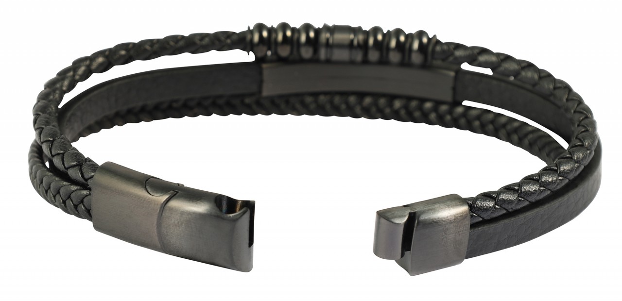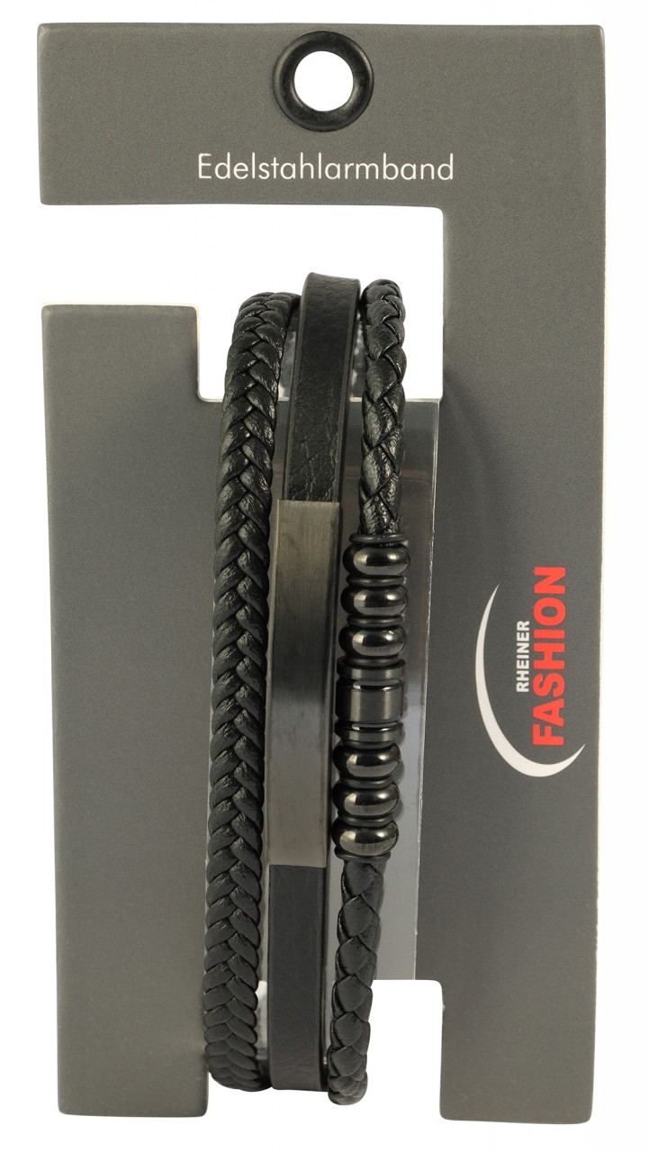 A pulseira “Daniele” da marca Akzent em pele sintética de alta qualidade impressiona pelos seus elementos de aço inoxidável preto, que fazem desta pulseira um acessório especial para os homens. Está disponível em dois comprimentos de 19 cm e 21 cm. Os três fios com visuais diferentes conferem à pulseira um aspeto dinâmico: um fio trançado, um fio torcido com elementos de aço inoxidável elegantemente roscados e um fio liso que possui uma placa de gravação (3,8 x 0,65 cm), ideal para uma gravação pessoal. O fecho magnético oferece uma fixação segura e a pulseira é fácil de colocar e retirar. A extensão adicional de 1 cm é simplesmente inserida no fecho, para que a pulseira se adapte perfeitamente a diferentes tamanhos de pulso.