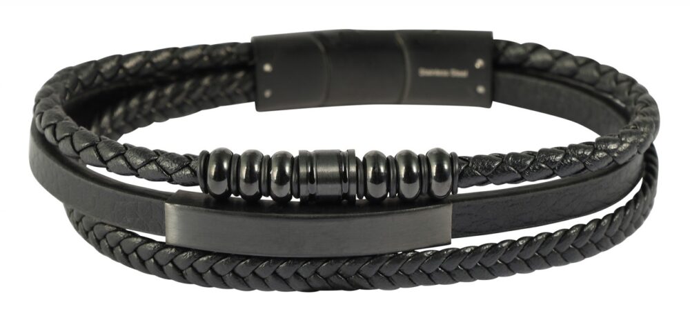 A pulseira “Daniele” da marca Akzent em pele sintética de alta qualidade impressiona pelos seus elementos de aço inoxidável preto, que fazem desta pulseira um acessório especial para os homens. Está disponível em dois comprimentos de 19 cm e 21 cm. Os três fios com visuais diferentes conferem à pulseira um aspeto dinâmico: um fio trançado, um fio torcido com elementos de aço inoxidável elegantemente roscados e um fio liso que possui uma placa de gravação (3,8 x 0,65 cm), ideal para uma gravação pessoal. O fecho magnético oferece uma fixação segura e a pulseira é fácil de colocar e retirar. A extensão adicional de 1 cm é simplesmente inserida no fecho, para que a pulseira se adapte perfeitamente a diferentes tamanhos de pulso.