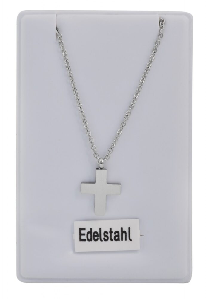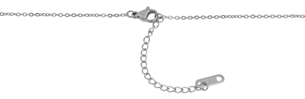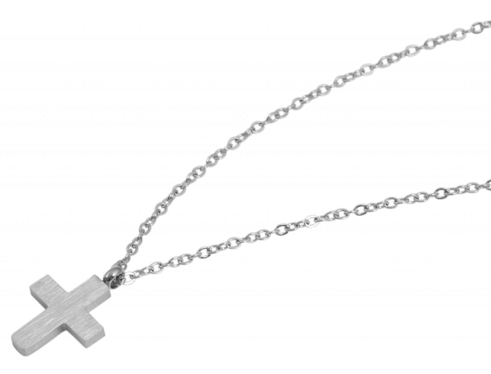A corrente de âncora com pingente em forma de cruz da marca Praktik é feita de aço inoxidável. O colar e o pingente de aço inoxidável são prateados. As dimensões da corrente são: comprimento 43 + 5 cm e espessura 1 mm. As dimensões do pingente são: comprimento 12 mm, largura 10 mm e espessura 1,5 mm.