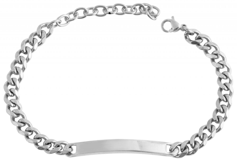A pulseira gravada da marca Akzent é feita em aço inoxidável em padrão blindado e está disponível em diversas cores. A pulseira pode ser aberta e fechada com um prático fecho lagosta, também feito em aço inoxidável. A pulseira do meio-fio tem 16 cm de comprimento, 4 mm de largura e 2 mm de espessura da corrente. Graças a uma corrente extensora, o comprimento pode ser aumentado em 5 cm e assim ajustado individualmente ao pulso. Há uma placa de gravação integrada no meio da pulseira. Tem comprimento de 39 mm e largura de 5 mm e pode ser fornecido com diversos tipos de gravuras. A faixa de identificação pode ser desenhada individual e pessoalmente, tornando-a um presente inesquecível.