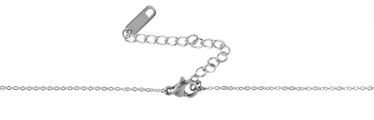 A corrente prateada da marca Akzent tem um padrão de âncora e é feita de aço inoxidável. A corrente tem também um pendente com 43 cm de comprimento, 1 mm de largura e 1 mm de espessura. O pendente tem 20 mm de comprimento, 9 mm de largura e 1 mm de espessura. A corrente pode ser aberta e fechada com um fecho de lagosta, que também é feito de aço inoxidável.