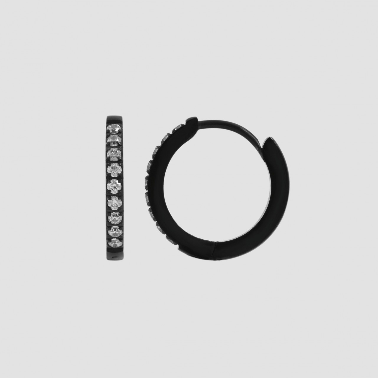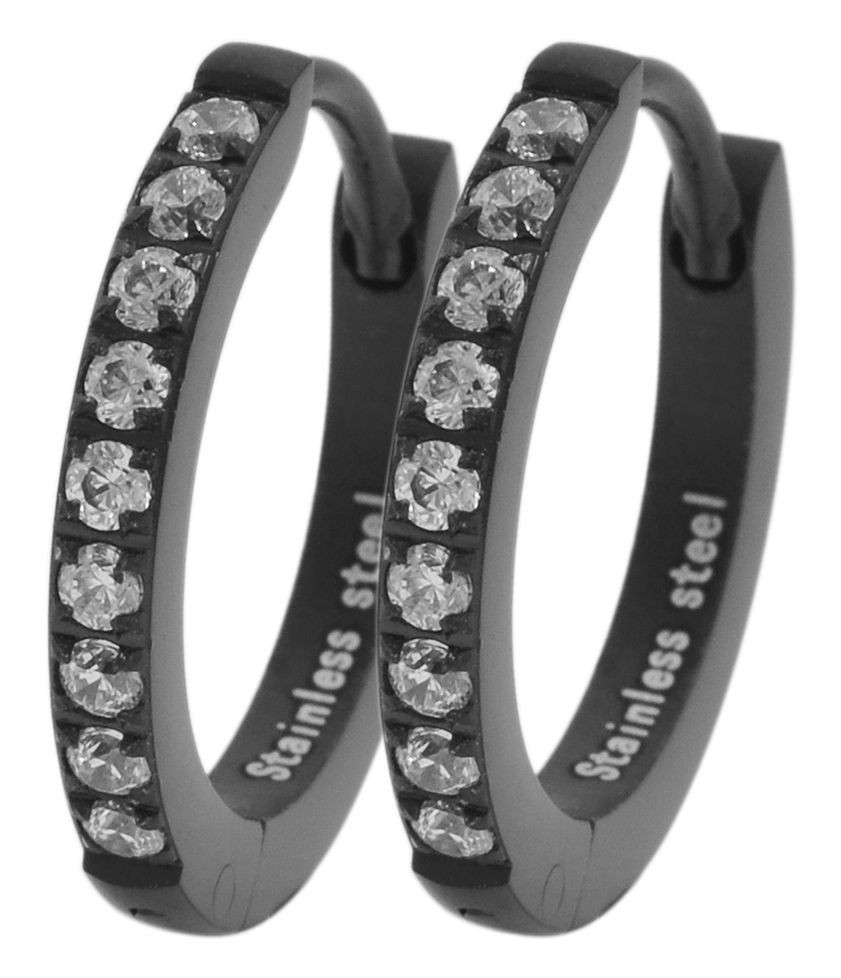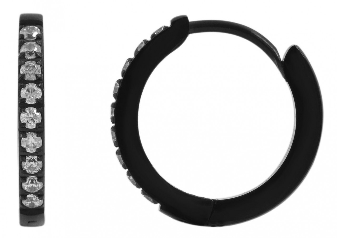 Os brincos de argola com dobradiças são fabricados em aço inoxidável e têm também um revestimento IP. Este revestimento contribui para uma melhor resistência aos riscos e para um melhor aspeto. Os brincos de argola são de cor preta. Os brincos são também cravejados com 9 pedras brilhantes similli por brinco de argola. O material tem um acabamento mate. Os brincos podem ser abertos e fechados facilmente com o fecho. O artigo tem as seguintes dimensões: Diâmetro: 12 mm, largura 2 mm e espessura 2 mm.