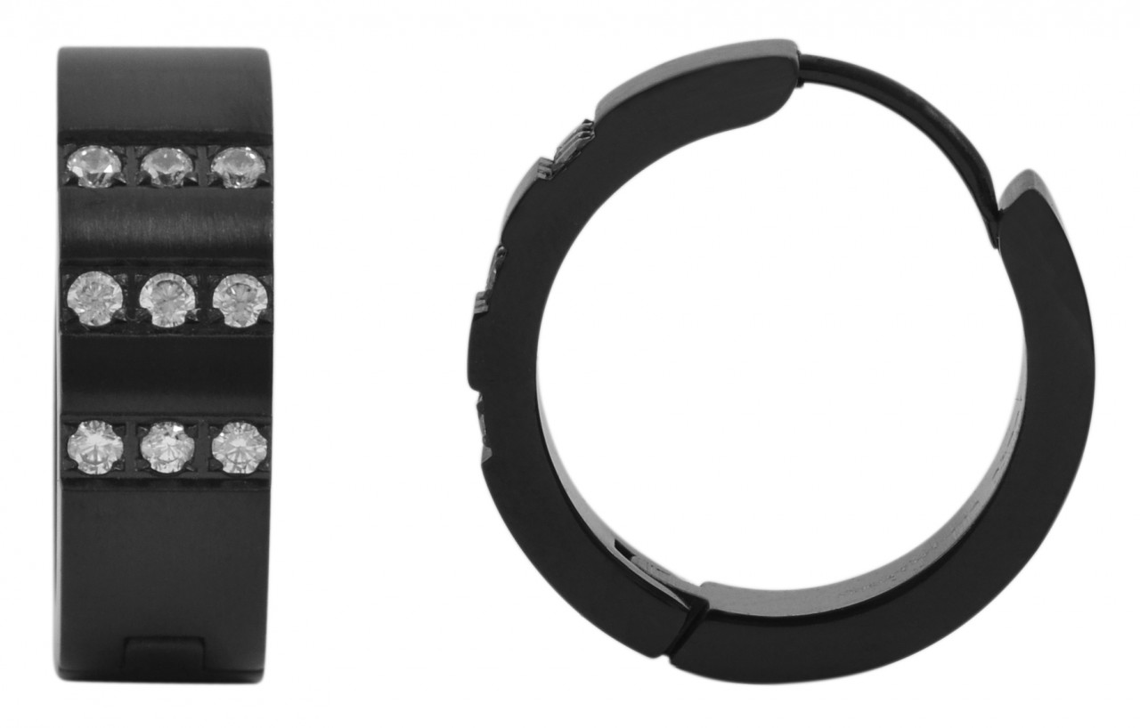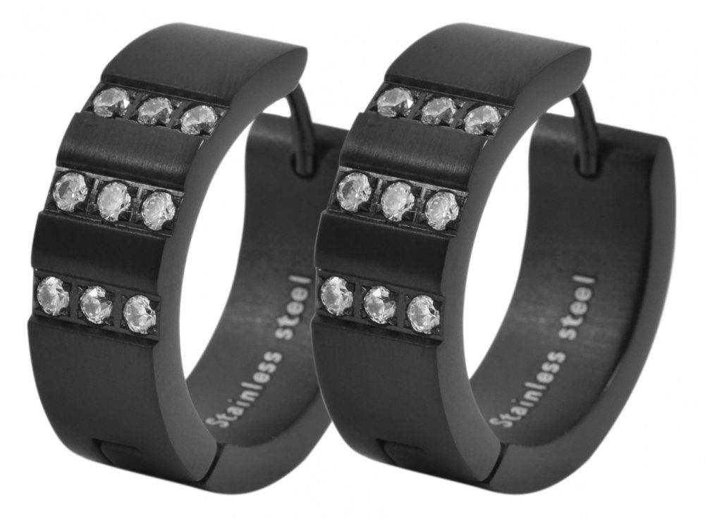 Os brincos de argola dobráveis são feitos de aço inoxidável e também possuem revestimento IP. Este revestimento contribui para uma melhor resistência a riscos e aparência. Além disso, os brincos são incrustados com 9 pedras semelhantes brilhantes por argola. A cor é preta. A textura do material é fosca. O fecho articulado permite que os brincos sejam abertos e fechados com facilidade. O item possui as seguintes dimensões: diâmetro: 16 mm, largura 7 mm e espessura 2,5 mm.