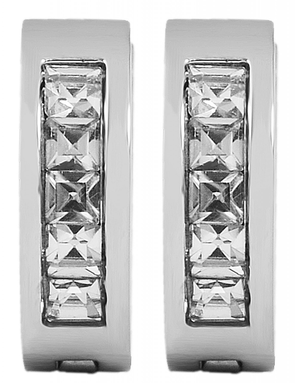 Os brincos de argola Akzent são feitos de aço inoxidável e são cravejados com 5 pedras brilhantes semelhantes. O fecho é um fecho com dobradiça feito de aço inoxidável. Os brincos de argola medem 9 mm de diâmetro, 4 mm de largura e 3 mm de espessura.