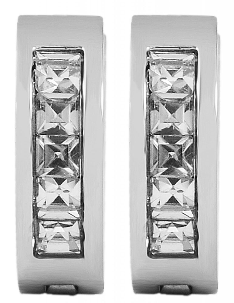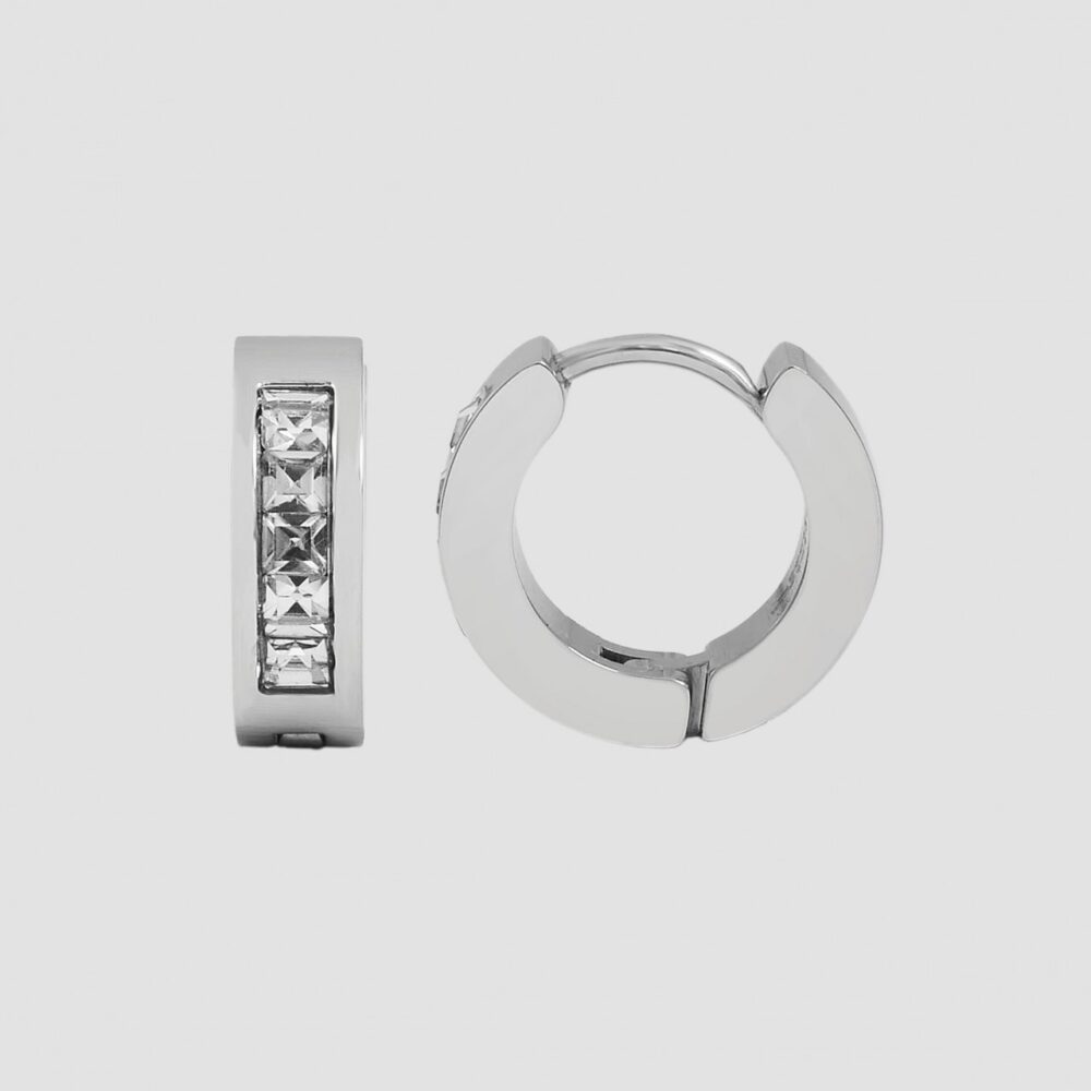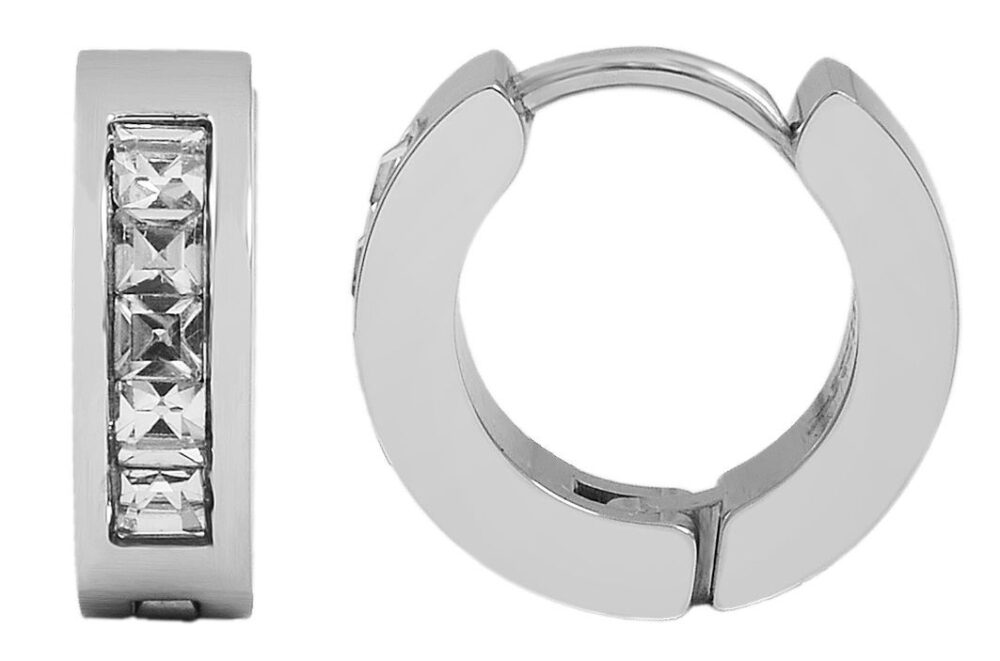 Os brincos de argola Akzent são feitos de aço inoxidável e são cravejados com 5 pedras brilhantes semelhantes. O fecho é um fecho com dobradiça feito de aço inoxidável. Os brincos de argola medem 9 mm de diâmetro, 4 mm de largura e 3 mm de espessura.