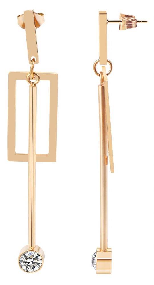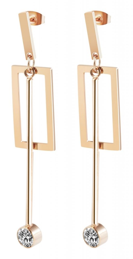 Brinco com detalhes em aço inoxidável. O fechamento é um fechamento plug-in. A textura é mostrada em aço inoxidável brilhante. O item tem as seguintes dimensões: comprimento: 7 cm, largura: 1,3 cm e 0,4 cm. Os brincos são realçados com uma pedra Swarovski e um retângulo aberto como pingente.