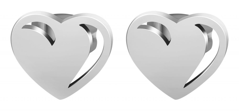 Os brincos da marca Praktik em forma de coração são feitos de aço inoxidável. A textura é mostrada em aço inoxidável brilhante. As laterais dos brincos de coração são deixadas de fora. O fecho é um fecho de aço inoxidável. O item tem comprimento de 9 mm, largura de 9 mm e espessura de 1 mm.