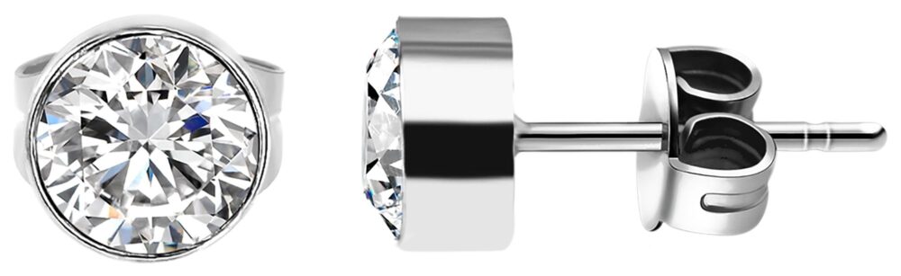 - Os brincos são polidos, com uma grande pedra similite no centro e podem ser fechados com um parafuso de asa em aço inoxidável.