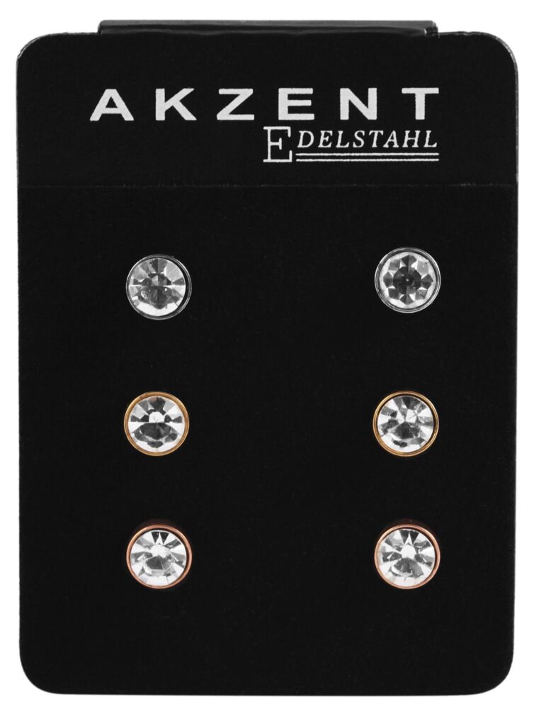Os brincos da marca Akzent, constituídos por um conjunto de três pares de brincos, são fabricados em aço inoxidável e têm também um revestimento IP.