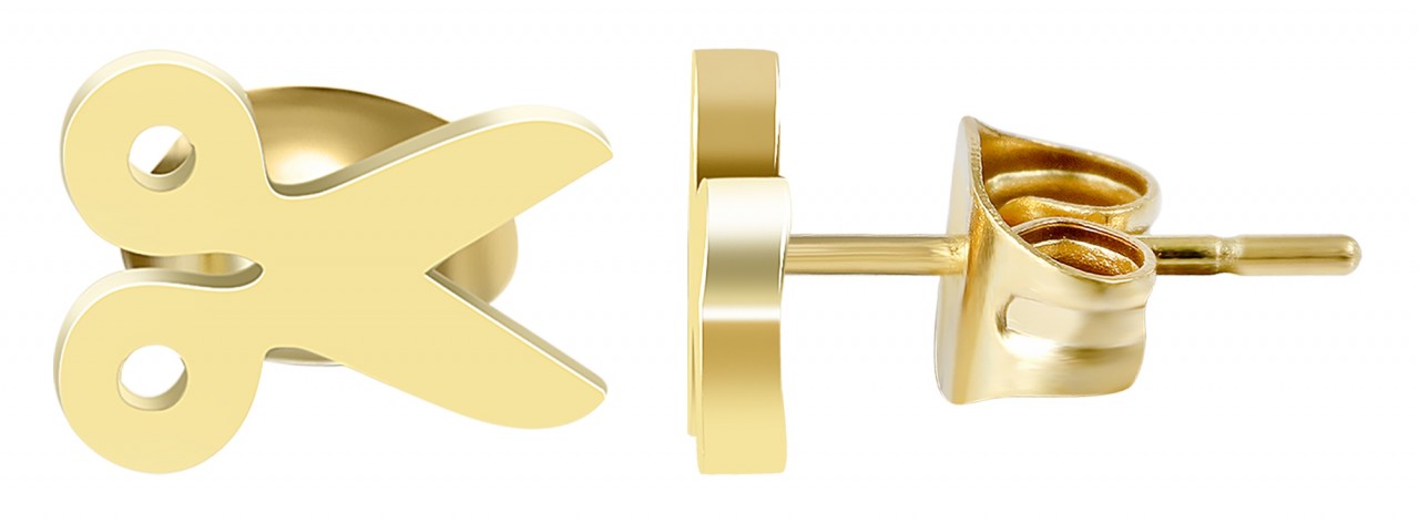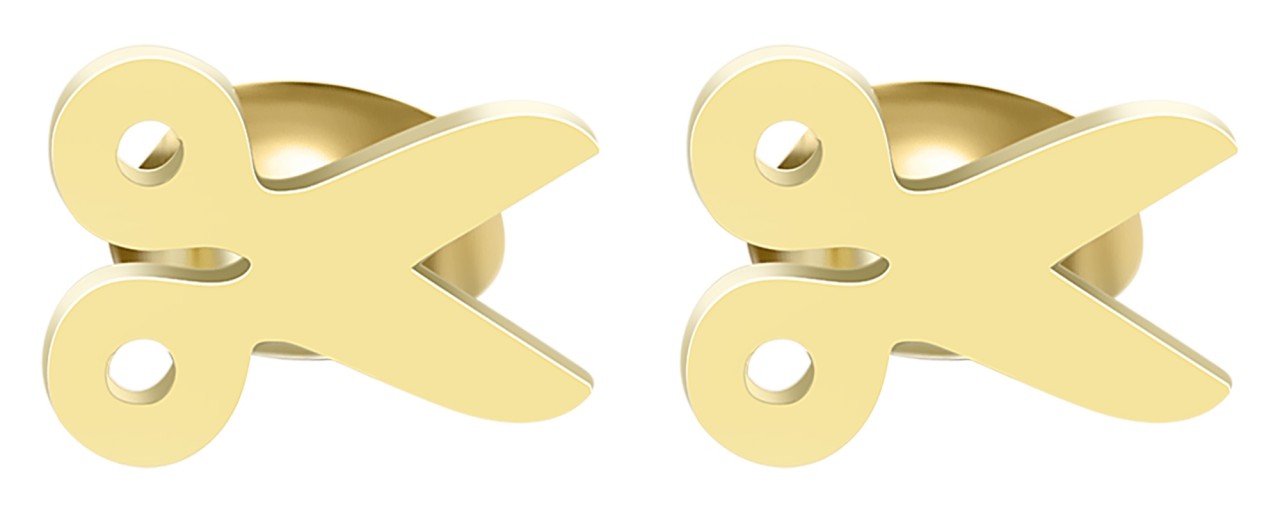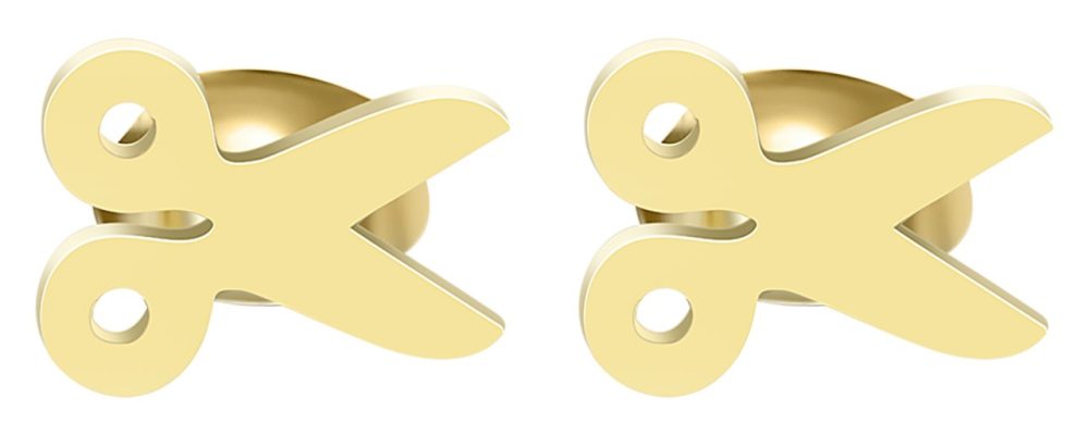 Os brincos da marca Praktik em formato de tesoura são feitos de aço inoxidável. Os brincos são polidos e podem ser fechados com parafuso borboleta de aço inoxidável. As dimensões do brinco são 9 mm de comprimento, 7 mm de largura e 1,5 mm de espessura.