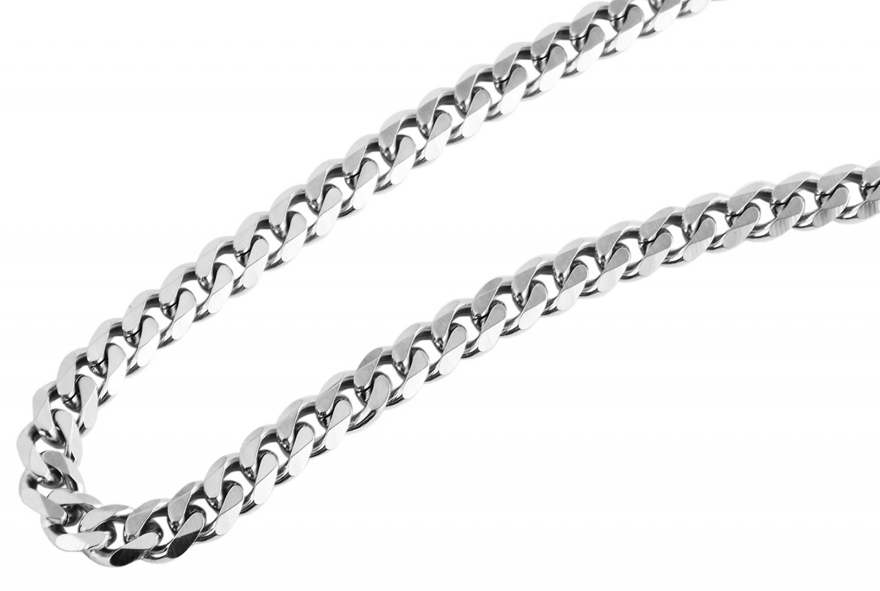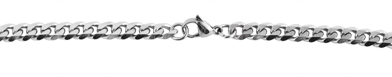 A corrente de aço inoxidável prateado da marca Praktik é feita em padrão tanque. Está disponível nos comprimentos de 43 cm, 50 cm, 60 cm e 70 cm. A corrente tem 7 mm de largura e espessura de material de 3 mm. A joia pode ser aberta e fechada com um mosquetão, que também é feito de aço inoxidável. O material da corrente de meio-fio sólida é robusto e garante uma longa vida útil. A corrente pode ser decorada com vários pingentes, mas mesmo sem ela chama muita atenção.