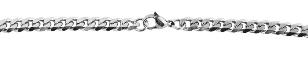 A corrente em aço inoxidável prateado da marca Akzent é feita em padrão tanque. Está disponível nos comprimentos de 43 cm, 50 cm, 60 cm e 70 cm. A corrente tem 7 mm de largura e espessura de material de 3 mm. A joia pode ser aberta e fechada com um mosquetão, que também é feito em aço inoxidável. O material da corrente de meio-fio sólida é robusto e garante uma longa vida útil. A corrente pode ser decorada com vários pingentes, mas mesmo sem nenhum ela chama muito à atenção.