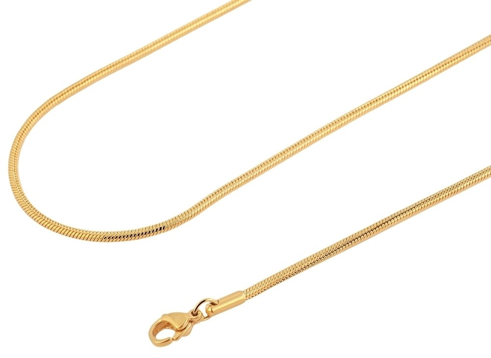 O colar dourado da marca Praktik é feito de aço inoxidável em padrão cobra e está disponível nos comprimentos de 40 cm, 45 cm e 50 cm. A espessura do material é de 2 mm. Além disso, uma corrente de extensão de 5 cm de comprimento é presa a uma extremidade da corrente. Isso permite variar o comprimento em até 5 cm e adaptar a joia a qualquer look. A corrente de cobra simples pode ser aberta e fechada com um mosquetão dourado, que também é feito de aço inoxidável.