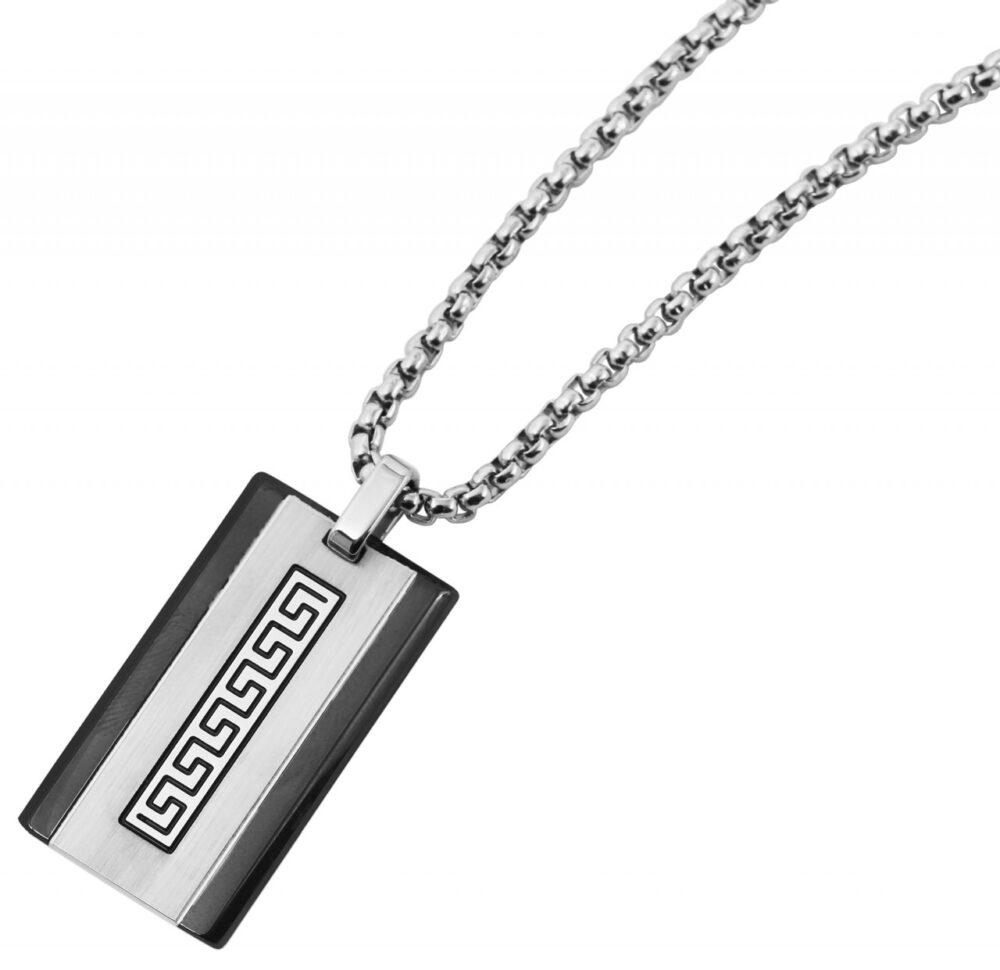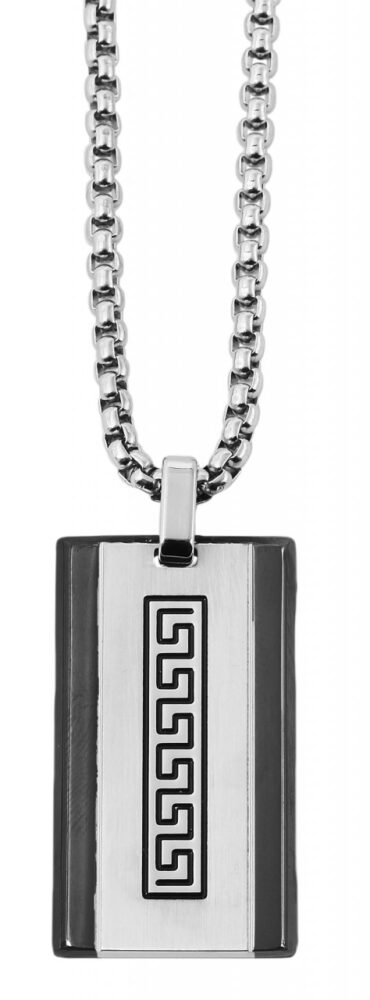 O colar da marca Akzent é feito de aço inoxidável e é composto por uma corrente veneziana prateada com 60 cm de comprimento e um pendente de 41 mm x 21 mm. O pendente está disponível em preto e dourado. Tem uma placa de aço inoxidável prateado de 34 mm x 12 mm no centro, na qual estão fresados motivos gregos. Estes são pretos e tornam a peça de joalharia moderna num atrativo muito especial. O colar vistoso pode ser aberto e fechado com um fecho de lagosta em aço inoxidável prateado. O colar com padrão veneziano é particularmente confortável de usar graças à sua estrutura, tornando-o um companheiro favorito para o uso diário. A peça de joalharia é também ideal como presente, por exemplo, para um aniversário, Dia dos Namorados ou Natal.