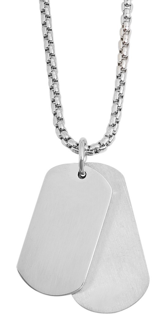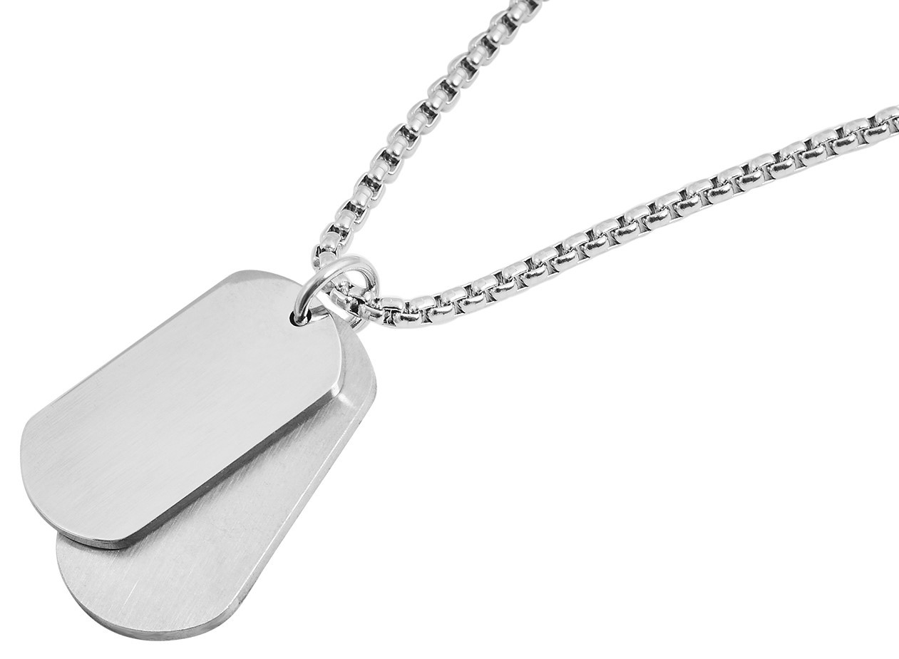 O colar no padrão Venezia da marca Praktik é feito de aço inoxidável. Este é fornecido com dois pingentes graváveis, também feitos de aço inoxidável. A corrente tem 55 cm de comprimento e pode ser aberta e fechada com um mosquetão. Além disso, uma corrente extensora de 5 cm de comprimento é fixada na ponta da corrente, o que permite variar o comprimento em até 5 cm e, portanto, pode ser adaptado a qualquer roupa. Os pingentes de gravação têm tamanhos diferentes. O maior tem aspecto mate e tem 26,5 mm de comprimento, 14 mm de largura e 1 mm de espessura. O pingente de corrente menor se destaca visualmente e tem um visual brilhante. Tem comprimento de 24 mm, largura de 12,5 mm e espessura de 1 mm.