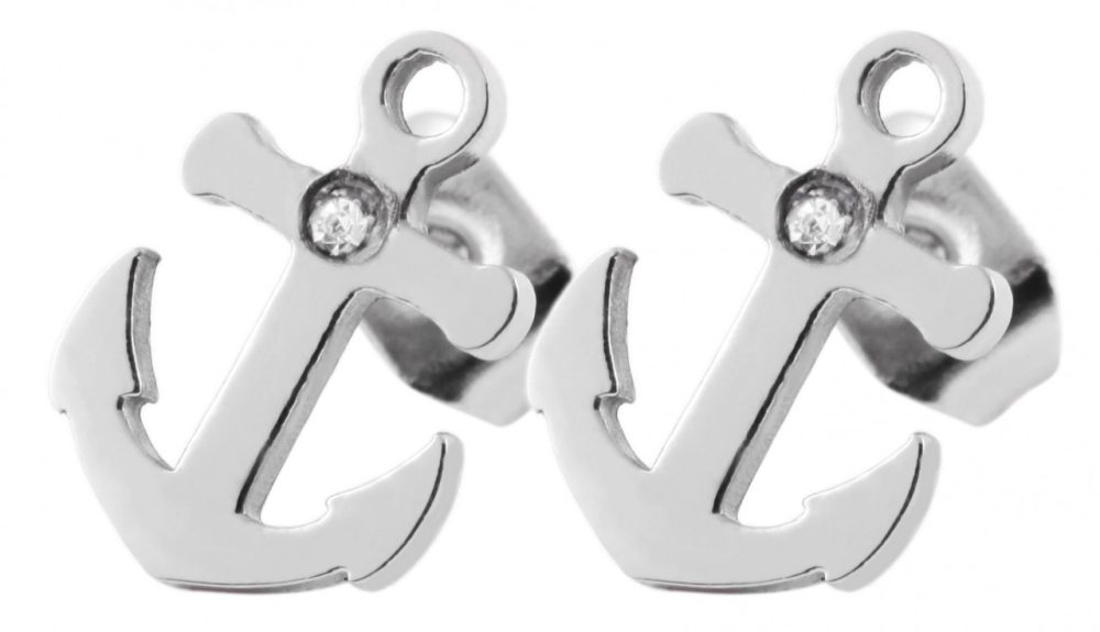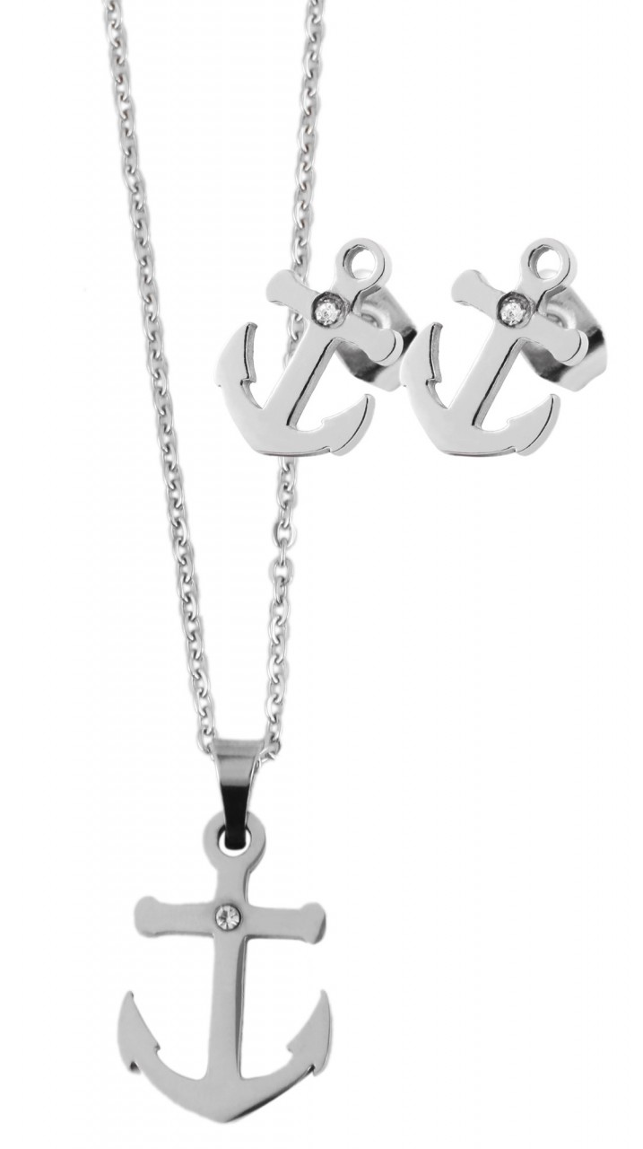 O conjunto de joias, composto por brincos e pingente correspondente com corrente em desenho de âncora marítima, foi feito de aço inoxidável. Os brincos com o popular motivo de âncora são adornados com uma pedra similite branca. Têm comprimento de 12 mm, largura de 8,5 mm e espessura de 1,5 mm. Os brincos podem ser presos ao orifício da orelha com um parafuso borboleta. A porca de silicone fornece suporte adicional. O pingente correspondente com uma corrente de 43 cm de comprimento, que pode ser estendida em mais 5 cm, combina muito bem com os brincos de âncora. O pingente âncora também é decorado…