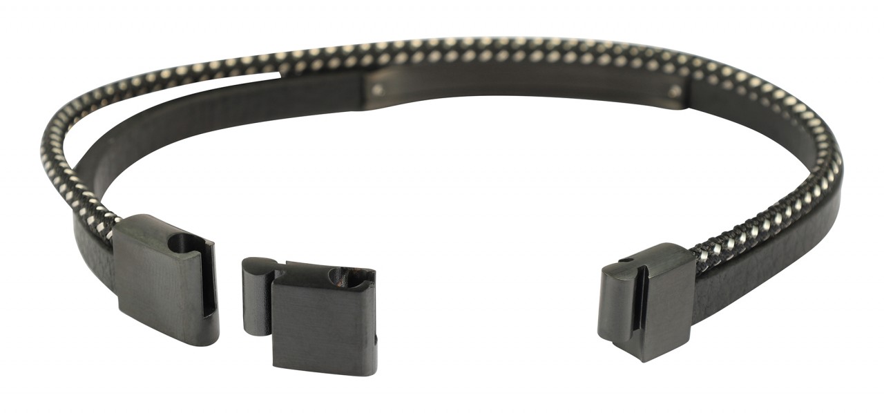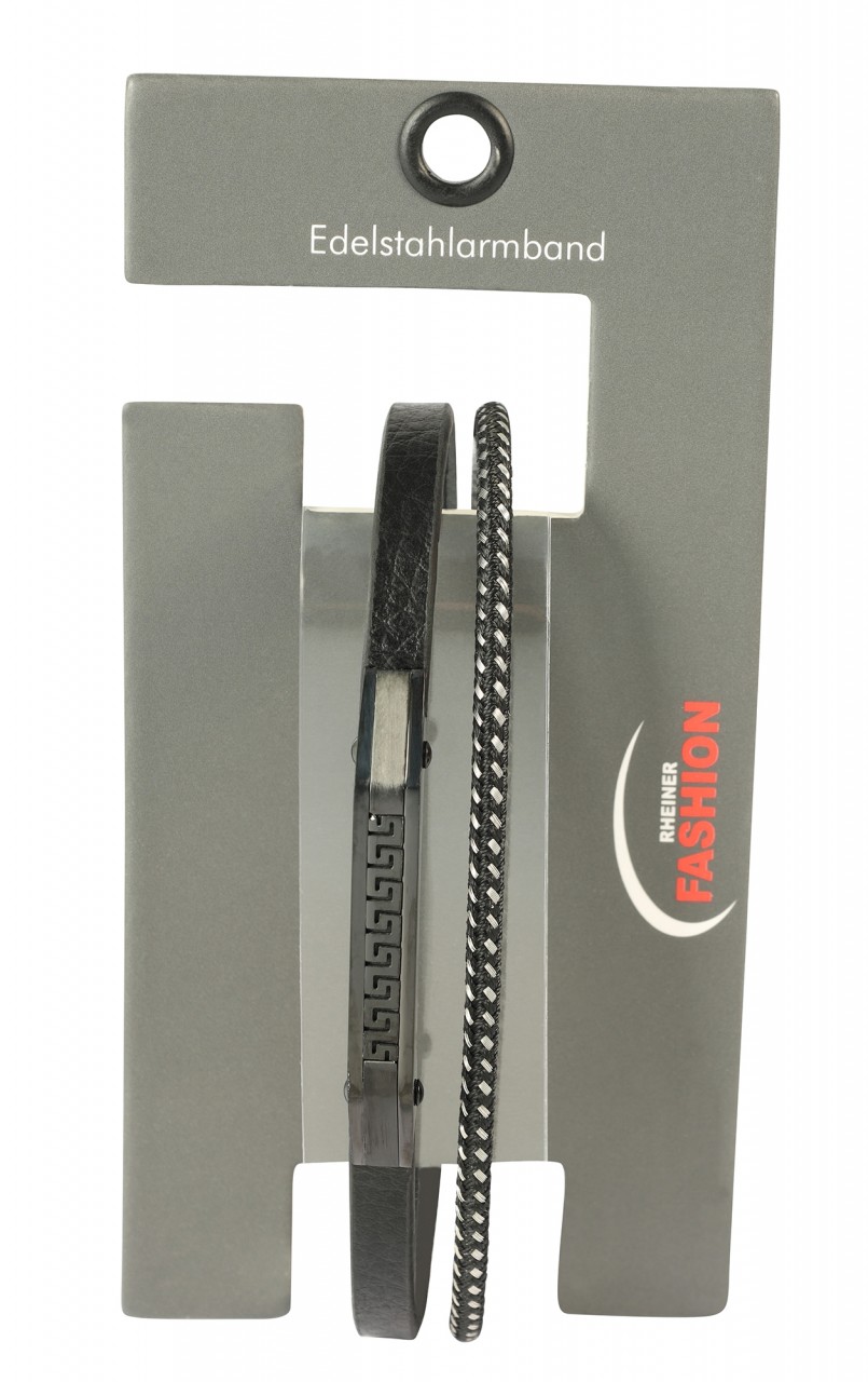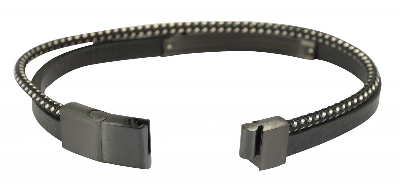 A pulseira “Emilio” feita em pele sintética de alta qualidade e com elementos de aço inoxidável preto está disponível em dois comprimentos de 19 cm e 21 cm, ambos os comprimentos possuem um elemento de extensão adicional de 1 cm, que pode ser usado. A pulseira é composta por dois fios que se harmonizam perfeitamente entre si. O primeiro fio é um cordão preto maciço com detalhes prateados, o segundo fio é feito de pele sintética preta com largura de 6 mm e um elemento de aço inoxidável de 4,5 x 0,6 mm. O elemento de aço inoxidável é decorado com um padrão elegante, mas ainda oferece espaço suficiente para gravação individual.