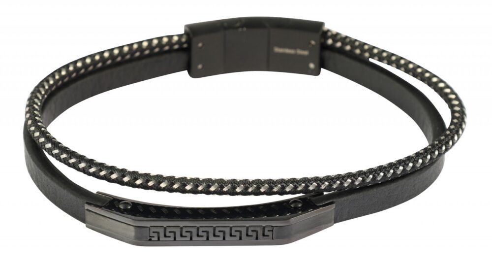 A pulseira “Emilio” feita em pele sintética de alta qualidade e com elementos de aço inoxidável preto está disponível em dois comprimentos de 19 cm e 21 cm, ambos os comprimentos possuem um elemento de extensão adicional de 1 cm, que pode ser usado. A pulseira é composta por dois fios que se harmonizam perfeitamente entre si. O primeiro fio é um cordão preto maciço com detalhes prateados, o segundo fio é feito de pele sintética preta com largura de 6 mm e um elemento de aço inoxidável de 4,5 x 0,6 mm. O elemento de aço inoxidável é decorado com um padrão elegante, mas ainda oferece espaço suficiente para gravação individual.