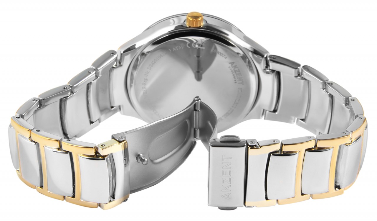 O relógio de pulso analógico de 3 ponteiros para homem da marca Akzent Exclusive possui um movimento de quartzo de alta qualidade. A pulseira de metal tem 23 mm de largura na alça e pode ser aberta e fechada com um fecho de clipe. O comprimento total do relógio é de 22 cm. A caixa de metal com vidro mineral tem um diâmetro de 42 mm e uma altura de 9 mm. O fundo da caixa é feito de aço inoxidável e o relógio tem resistência à água de 3 ATM. Um destaque visual é a borda espelhada preta de 3 mm de largura no vidro, que confere ao relógio uma aparência particularmente elegante. O mostrador é simples e os ponteiros e os números têm a mesma cor. Eles combinam bem com a aparência geral do relógio.